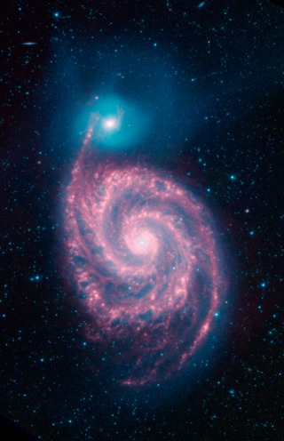 This image shows the Whirlpool galaxy, also known as Messier 51 and NGC 5194/5195, which is actually a pair of galaxies. Located approximately 23 million light-years away, it resides in the constellation Canes Venatici. This image combines two visible light wavelengths (in blue and green) and infrared light (in red) seen by NASA's Spitzer Space Telescope.
