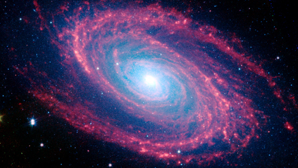 The magnificent spiral arms of the nearby galaxy Messier 81 are highlighted in this image from NASA's Spitzer Space Telescope. This Spitzer infrared image is a composite mosaic combining data from the Infrared Array Camera (IRAC) at wavelengths of 3.6/4.5 microns (blue/cyan) and 8 microns (green) with data from the Multiband Imaging Photometer (MIPS) at 24 microns (red).