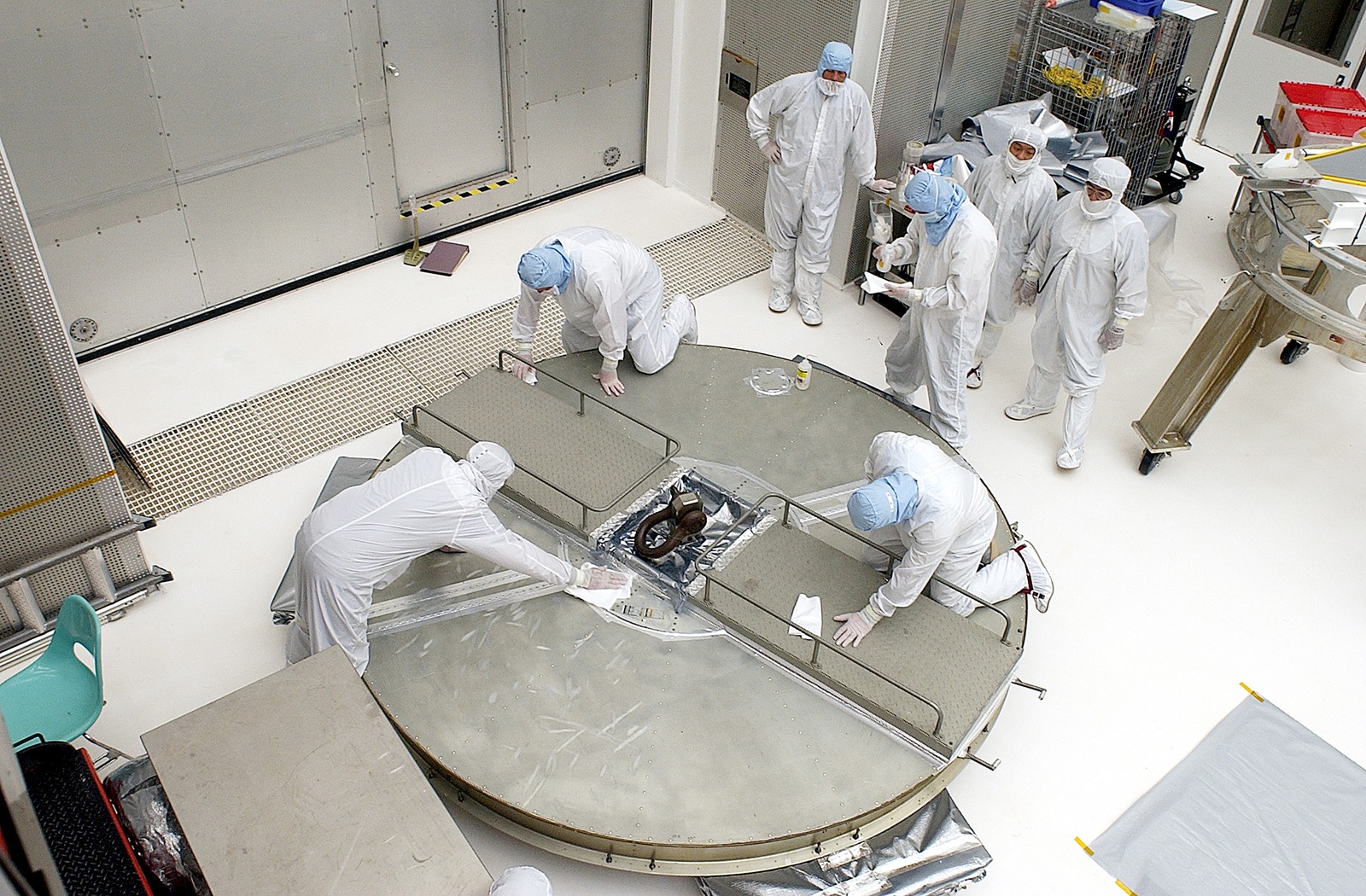 The Spitzer Space Telescope is placed in its payload canister for transfer to the launch pad before its aborted earlier launch. Spitzer was later moved back off its rocket and subsequently launched on a different vehicle on August 25, 2003.