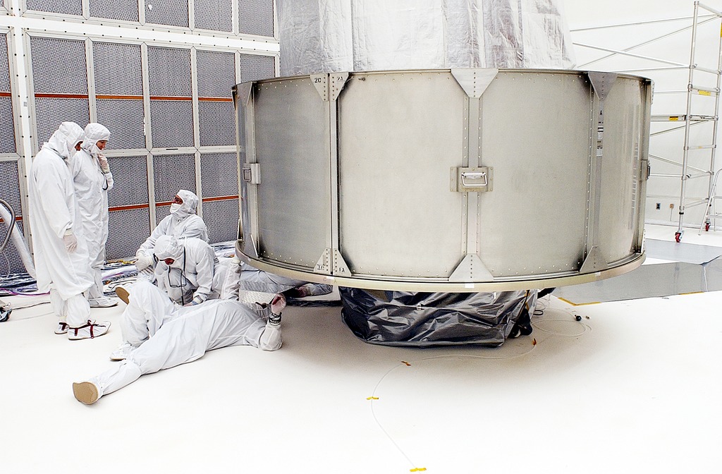 The Spitzer Space Telescope is placed in its payload canister for transfer to the launch pad before its aborted earlier launch. Spitzer was later moved back off its rocket and subsequently launched on a different vehicle on August 25, 2003.