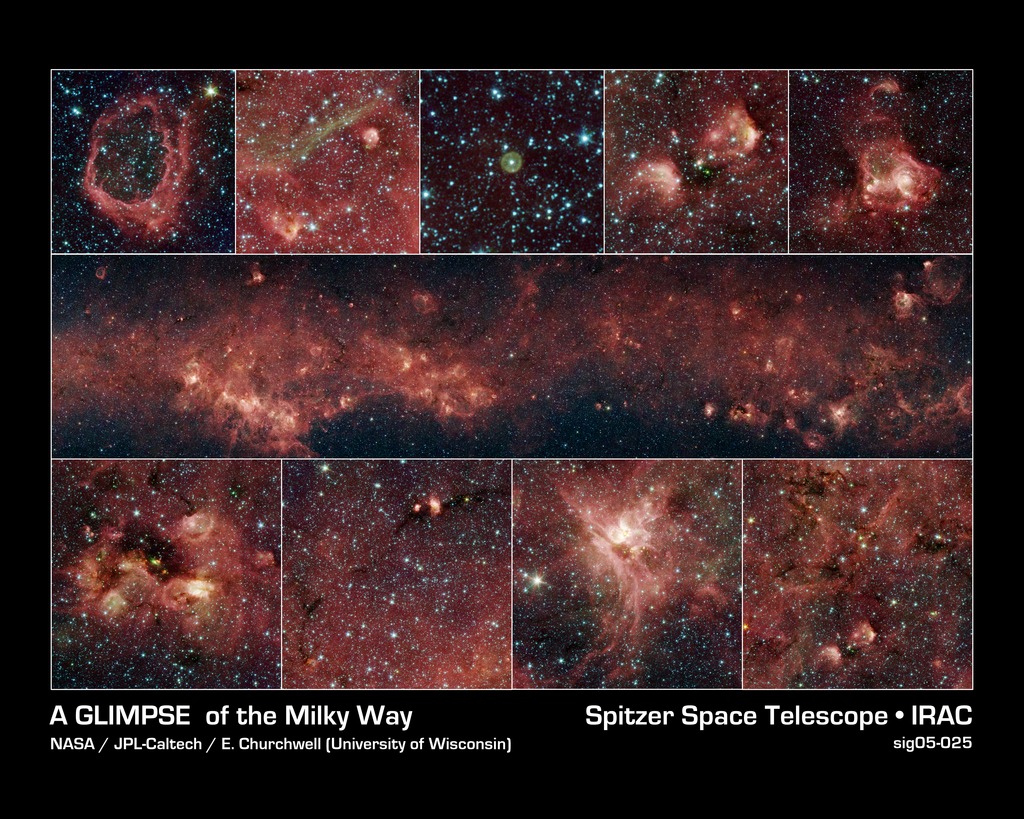 In this panoramic image (center row) from the Galactic Legacy Infrared Mid-Plane Survey Extraordinaire (GLIMPSE) project, a plethora of stellar activity in the Milky Way's galactic plane, reaching to the far side of our galaxy, is exposed. This image spans 9 degrees of sky (approximately the width of a fist held out at arm's length).