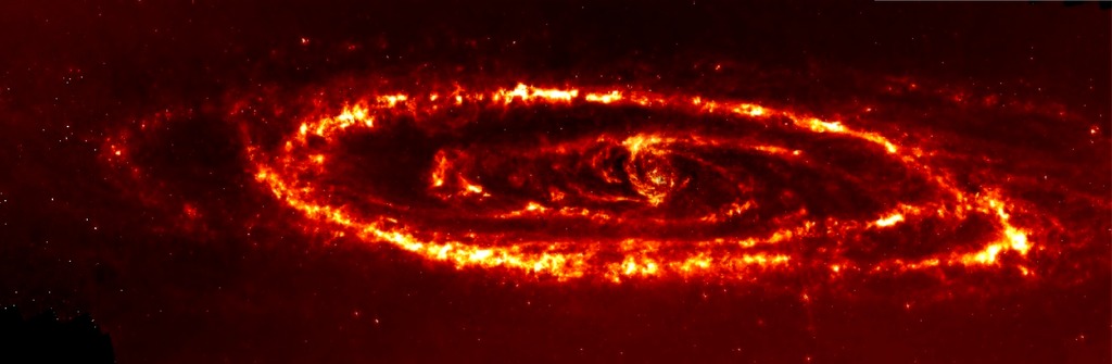 Astronomers have new evidence that the Andromeda spiral galaxy was involved in a violent head-on collision with the neighboring dwarf galaxy Messier 32 (M32) more than 200 million years ago. Infrared photographs taken with NASA's Spitzer Space Telescope revealed a never-before-seen dust ring deep within the Andromeda galaxy. When combined with a previously observed outer ring, the presence of both dust rings suggests that M32 plunged through the disk of Andromeda along Andromeda's polar axis approximately 210 million years ago.