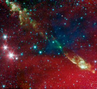 Infrared light with a wavelength of 3.6 microns has been color-coded blue; 4.5-micron light is green; and 8.0-micron light is red.