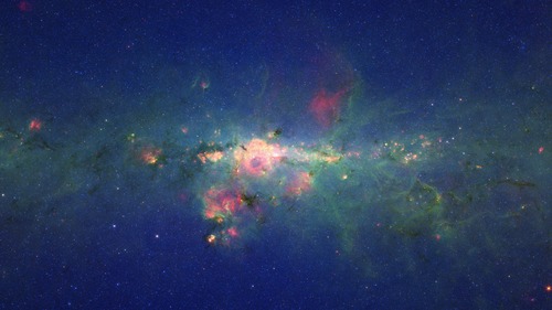 In this Spitzer image, the myriad of stars crowding the center of our galaxy creates the blue haze that brightens towards the center of the image. The green features are from carbon-rich dust molecules, called polycyclic aromatic hydrocarbons, which are illuminated by the surrounding starlight as they swirl around the galaxy's core. The yellow-red patches are the thermal glow from warm dust. The polycyclic aromatic hydrocarbons and dust are associated with bustling hubs of young stars. These materials, mixed with gas, are required for making new stars.