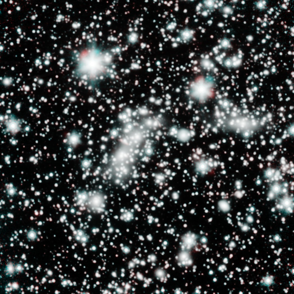 These Spitzer observations at wavelengths of 3.5 and 4.6 microns are shown in blue and red, respectively.