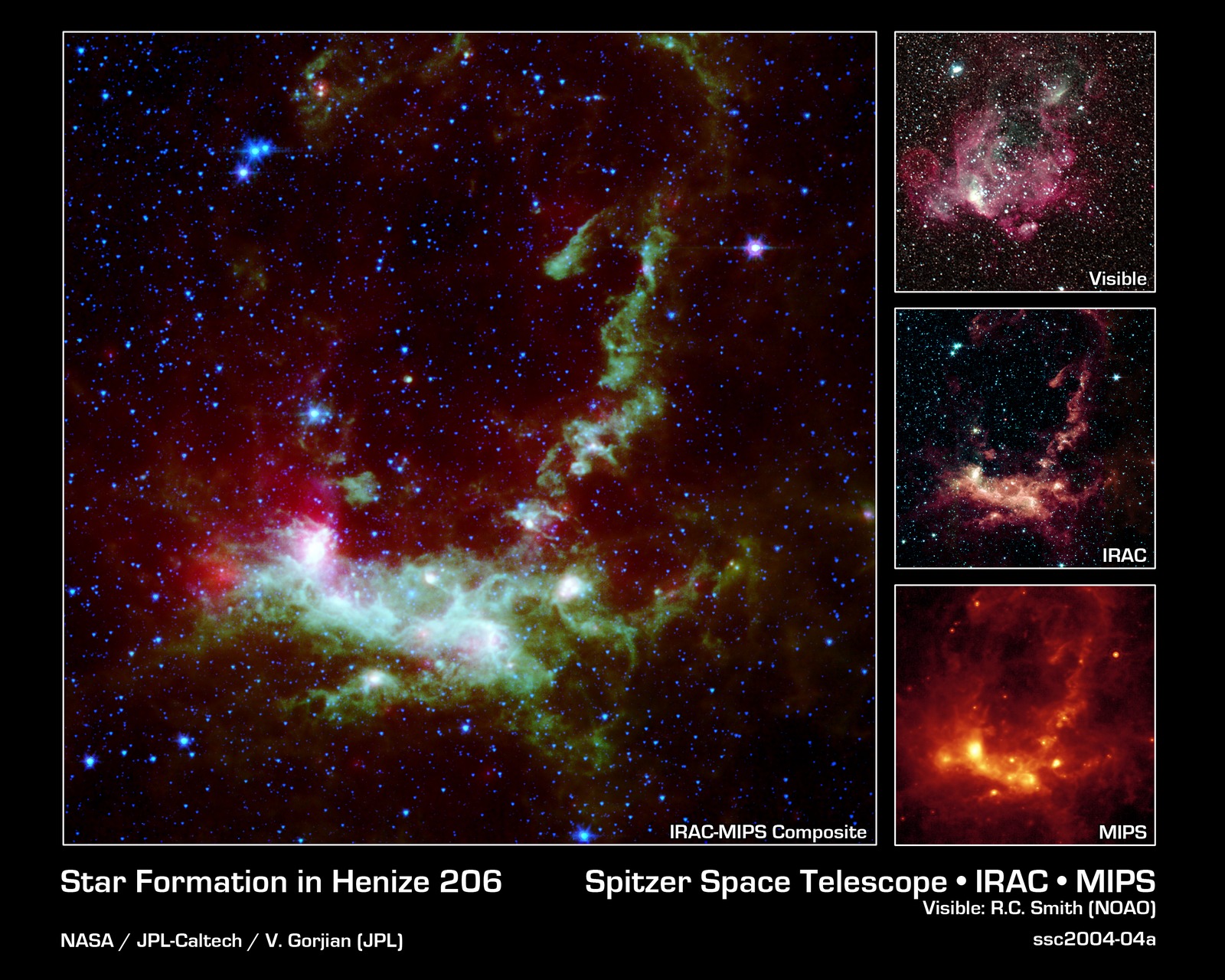 The primary Spitzer image, showing the wispy filamentary structure of Henize 206, is a four-color composite mosaic created by combining data from an infrared array camera (IRAC) at near-infrared wavelengths and the mid-infrared data from a multiband imaging photometer (MIPS). Blue represents invisible infrared light at wavelengths of 3.6 and 4.5 microns. Note that most of the stars in the field of view radiate primarily at these short infrared wavelengths. Cyan denotes emission at 5.8 microns, green depicts the 8.0 micron light, and red is used to trace the thermal emission from dust at 24 microns. The separate instrument images are included as insets to the main composite.