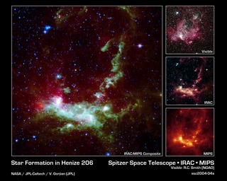 This emission nebula was cataloged by Karl Henize (HEN-eyes) while spending 1948-1951 in South Africa doing research for his Ph.D. dissertation at the University of Michigan. Henize later became a NASA astronaut and, at age 59, became the oldest rookie to fly on the Space Shuttle during an eight-day flight of the Challenger in 1985. He died just short of his 67th birthday in 1993 while attempting to climb the north face of Mount Everest, the world's highest peak.