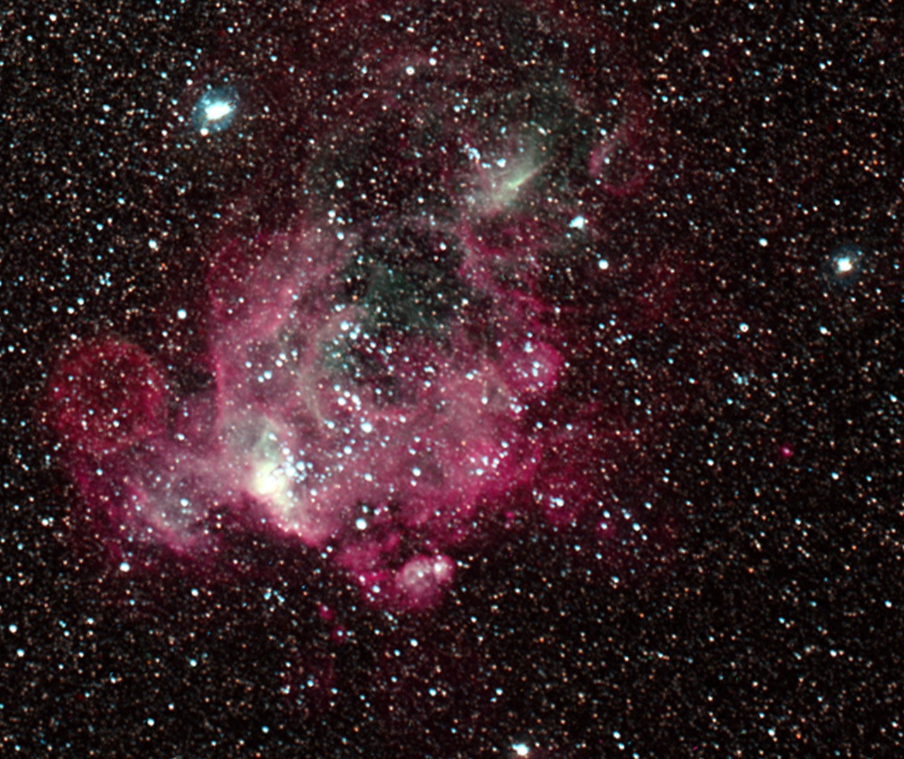 This image shows a visible-light view of the emission nebula, Henize 206, which lies within the Large Magellanic Cloud (LMC). The LMC is a nearby and irregularly-shaped galaxy seen in the Southern Hemisphere. Embedded within Henize 206 is a region of star formation which is hidden in this image by obscuring dust.