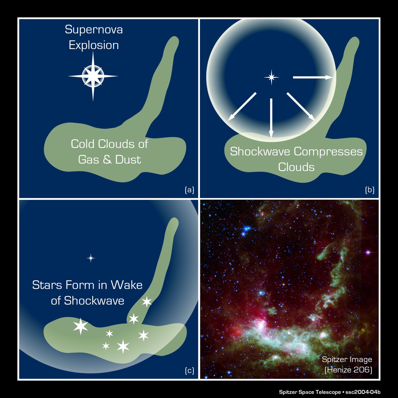 This three-panel diagram shows the process of triggered star formation. In the first panel, a massive, dying star explodes or "goes supernova." In the second panel, the shock wave from this explosion passes through clouds of gas and dust (green). In the third panel, a new wave of stars is born within the cloud, induced by the shock from the supernova blast. The whole progression, from the death of one star to the birth of others, takes millions of years to complete.