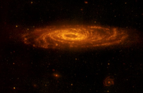 This infrared image from NASA's Spitzer Space Telescope has captured a nearby spiral galaxy that resembles our own Milky Way. The galaxy, known as NGC 7331 and sometimes referred to as our galaxy's twin, is found in the constellation Pegasus at a distance of 50 million light-years. This inclined galaxy was discovered in 1784 by William Herschel, who also discovered infrared light.