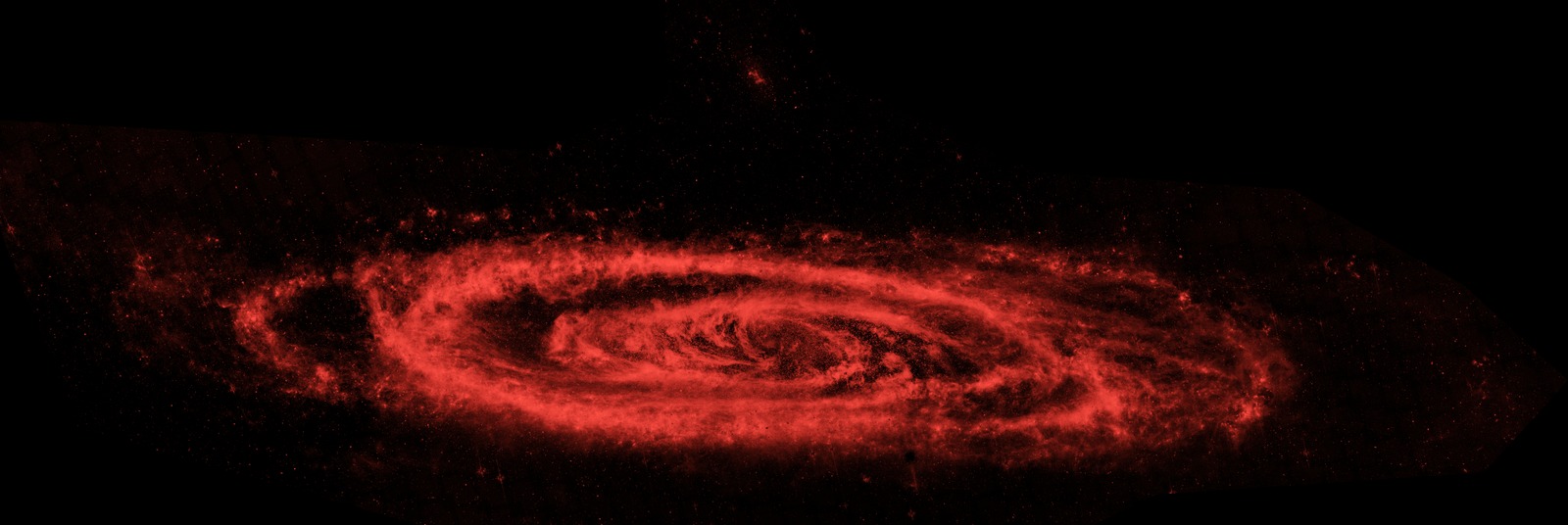 Because this galaxy is so large, the infrared images had to be stitched together out of about 3,000 separate Spitzer exposures. The light detected by Spitzer's infrared array camera at 8-microns shows warm dust and is shown in red. The contribution from starlight has been subtracted from the 8-micron image to better highlight the dust structures.