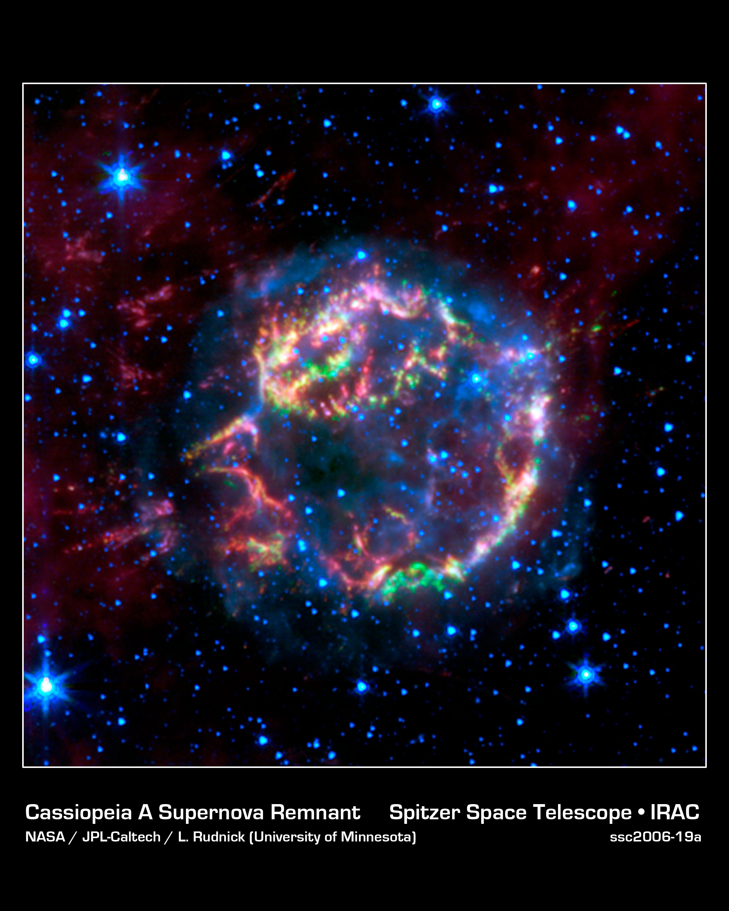 This image from NASA's Spitzer Space Telescope shows the scattered remains of an exploded star named Cassiopeia A. Spitzer's infrared detectors "picked" through these remains and found that much of the star's original layering had been preserved.