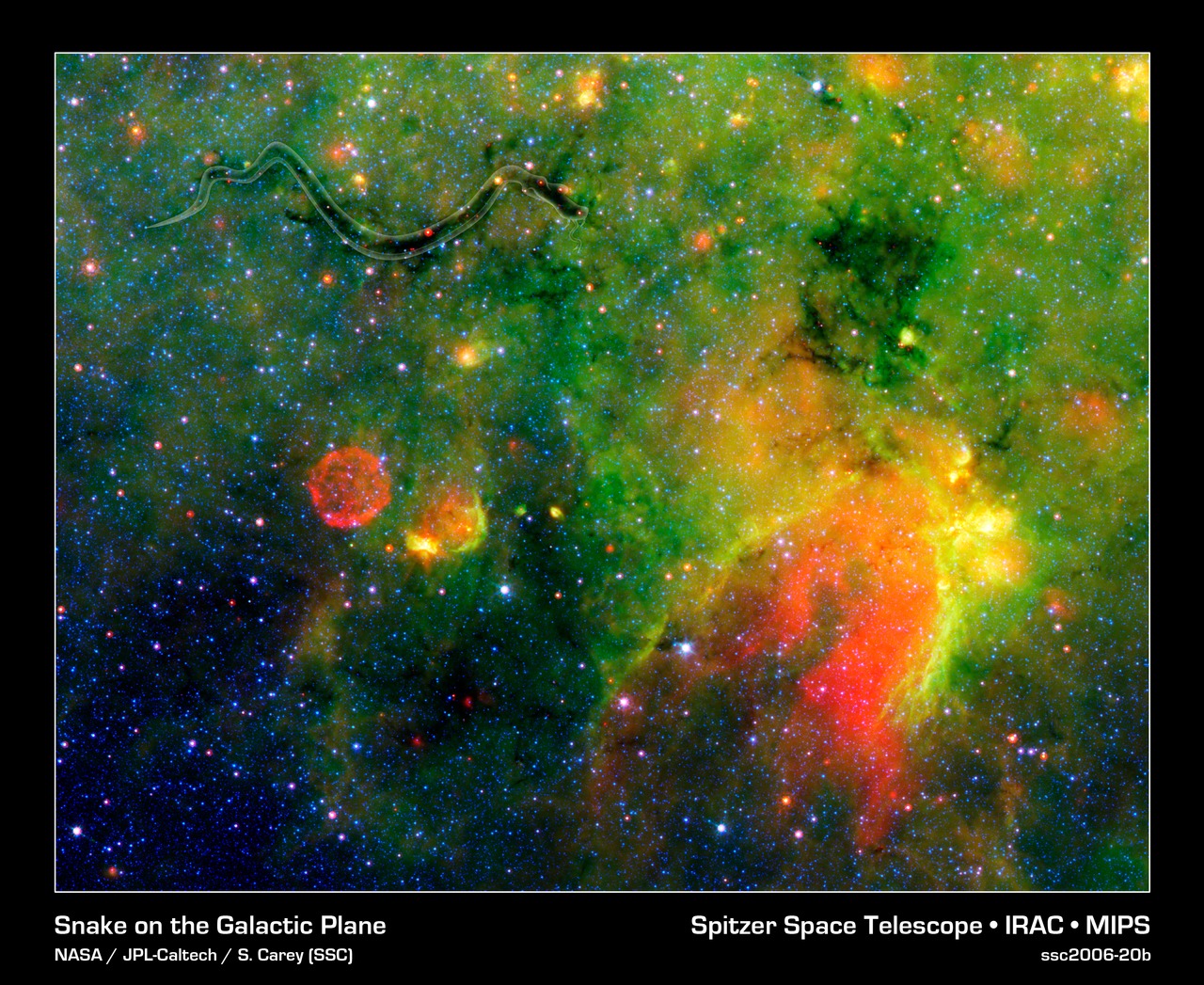 This infrared image from NASA's Spitzer Space Telescope shows what astronomers are referring to as a "snake" (upper left) and its surrounding stormy environment. The sinuous object is actually the core of a thick, sooty cloud large enough to swallow dozens of solar systems. In fact, astronomers say the "snake's belly" may be harboring beastly stars in the process of forming.The galactic creepy crawler to the right of the snake is another thick cloud core, in which additional burgeoning massive stars might be lurking. The colorful regions below the two cloud cores are less dense cloud material, in which dust has been heated by starlight and glows with infrared light. Yellow and orange dots throughout the image are monstrous developing stars; the red star on the "belly" of the snake is 20 to 50 times as massive as our sun. The blue dots are foreground stars.The red ball at the bottom left is a "supernova remnant," the remains of massive star that died in a fiery blast. Astronomers speculate that radiation and winds from the star before it died, in addition to a shock wave created when it exploded, might have played a role in creating the snake.Spitzer was able to spot the two black cloud cores using its heat-seeking infrared vision. The objects are hiding in the dusty plane of our Milky Way galaxy, invisible to optical telescopes. Because their heat, or infrared light, can sneak through the dust, they first showed up in infrared images from past missions. The cloud cores are so thick with dust that if you were to somehow transport yourself into the middle of them, you would see nothing but black, not even a star in the sky. Now, that's spooky!Spitzer's new view of the region provides the best look yet at the massive embryonic stars hiding inside the snake. Astronomers say these observations will ultimately help them better understand how massive stars form. By studying the clustering and range of masses of the stellar embryos, they hope to determine if the stars were born in the same way that our low-mass sun was formed -- out of a collapsing cloud of gas and dust -- or by another mechanism in which the environment plays a larger role.The snake is located about 11,000 light-years away in the constellation Sagittarius.This false-color image is a composite of infrared data taken by Spitzer's infrared array camera and multiband imaging photometer. Blue represents 3.6-micron light; green shows light of 8 microns; and red is 24-micron light.