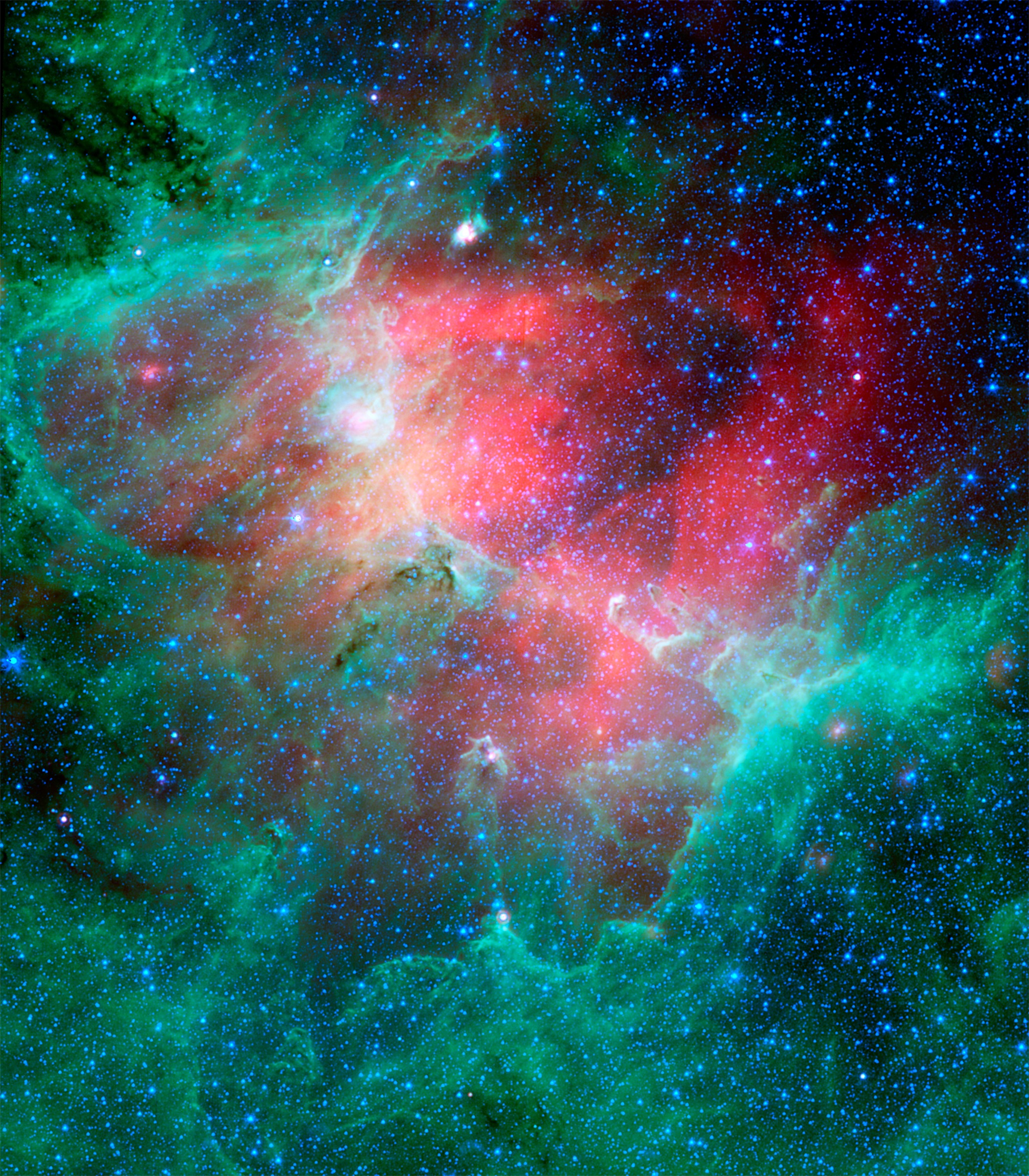The color green denotes cooler towers and fields of dust, including the three famous space pillars, dubbed the "Pillars of Creation," which were photographed by NASA's Hubble Space Telescope in 1995.