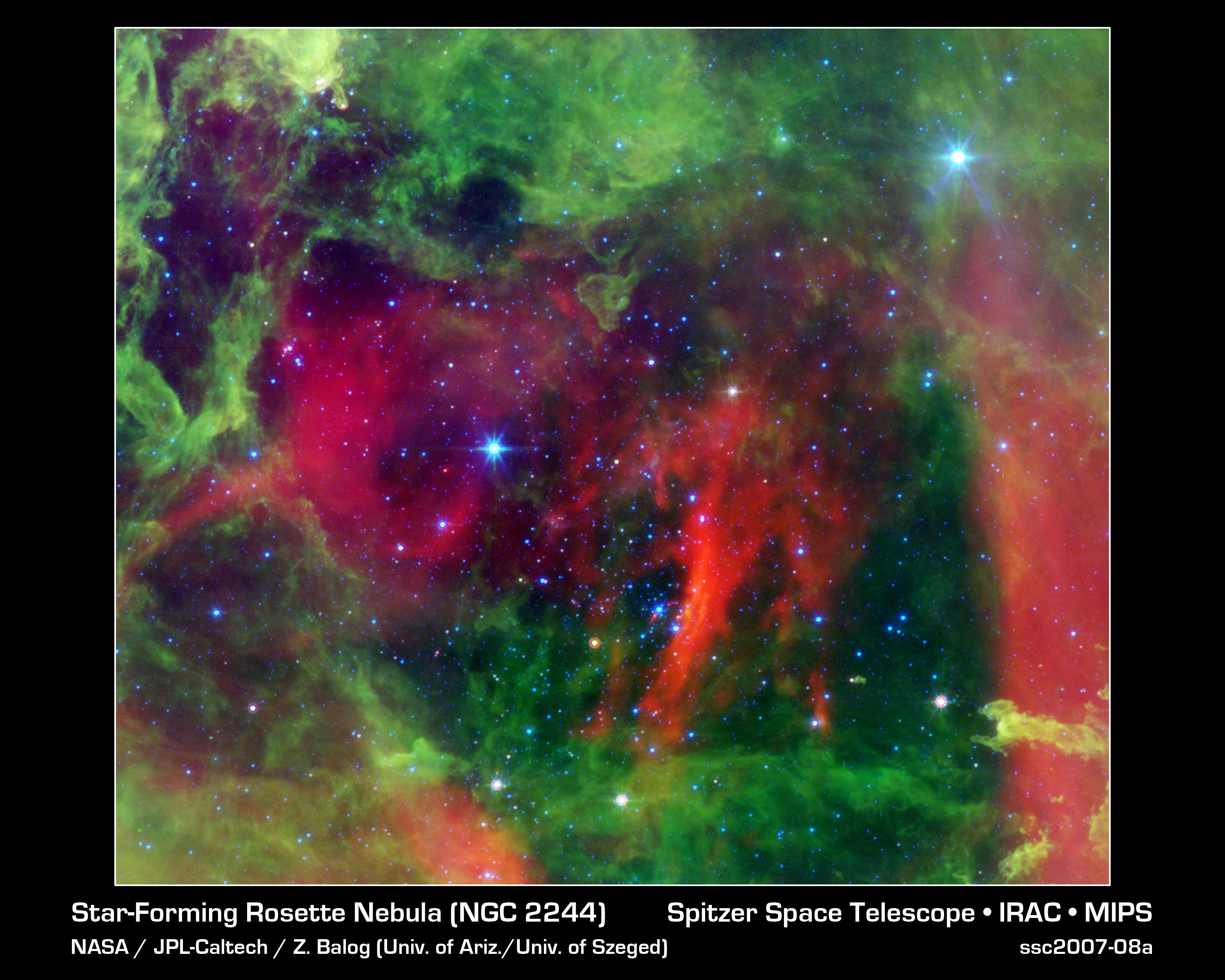 This infrared image from NASA's Spitzer Space Telescope shows the Rosette nebula, a pretty star-forming region more than 5,000 light-years away in the constellation Monoceros. In optical light, the nebula looks like a rosebud, or the "rosette" adornments that date back to antiquity.