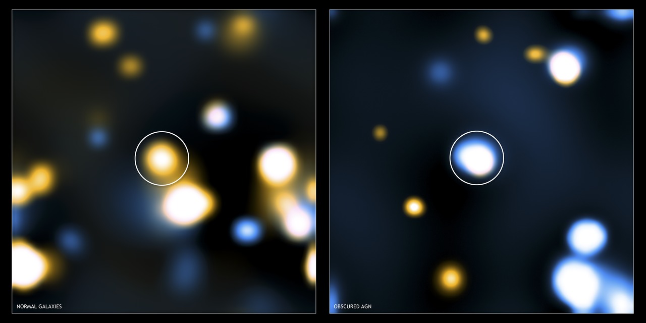 On the right, is a stacked Chandra image for galaxies with infrared emission exceeding the levels likely to be caused by star formation. These galaxies contain active galactic nuclei, or quasars, in their centers. These are luminous objects powered by the rapid growth of supermassive black holes. The obscured quasars show much higher levels of high-energy X-ray emission because the less energetic X-rays are mostly absorbed by gas.