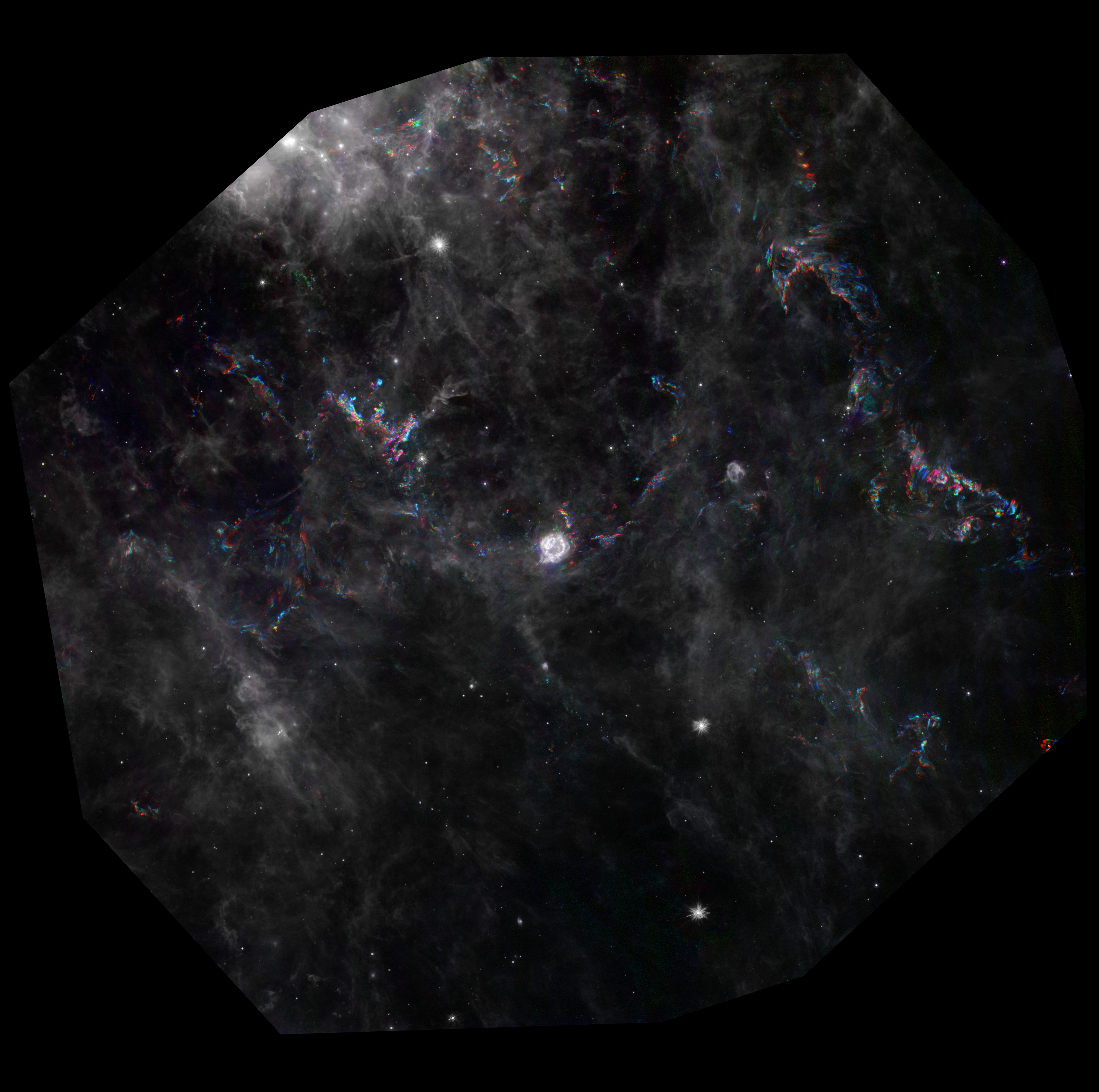Dust features that have not changed over time appear gray, while those that have changed are colored blue or orange. Bluer colors represent an earlier time and redder ones, a later time. Certain areas of the light echo are displayed in more detail to show the turbulent patterns formed as the light echo illuminates different areas of gas and dust over time.