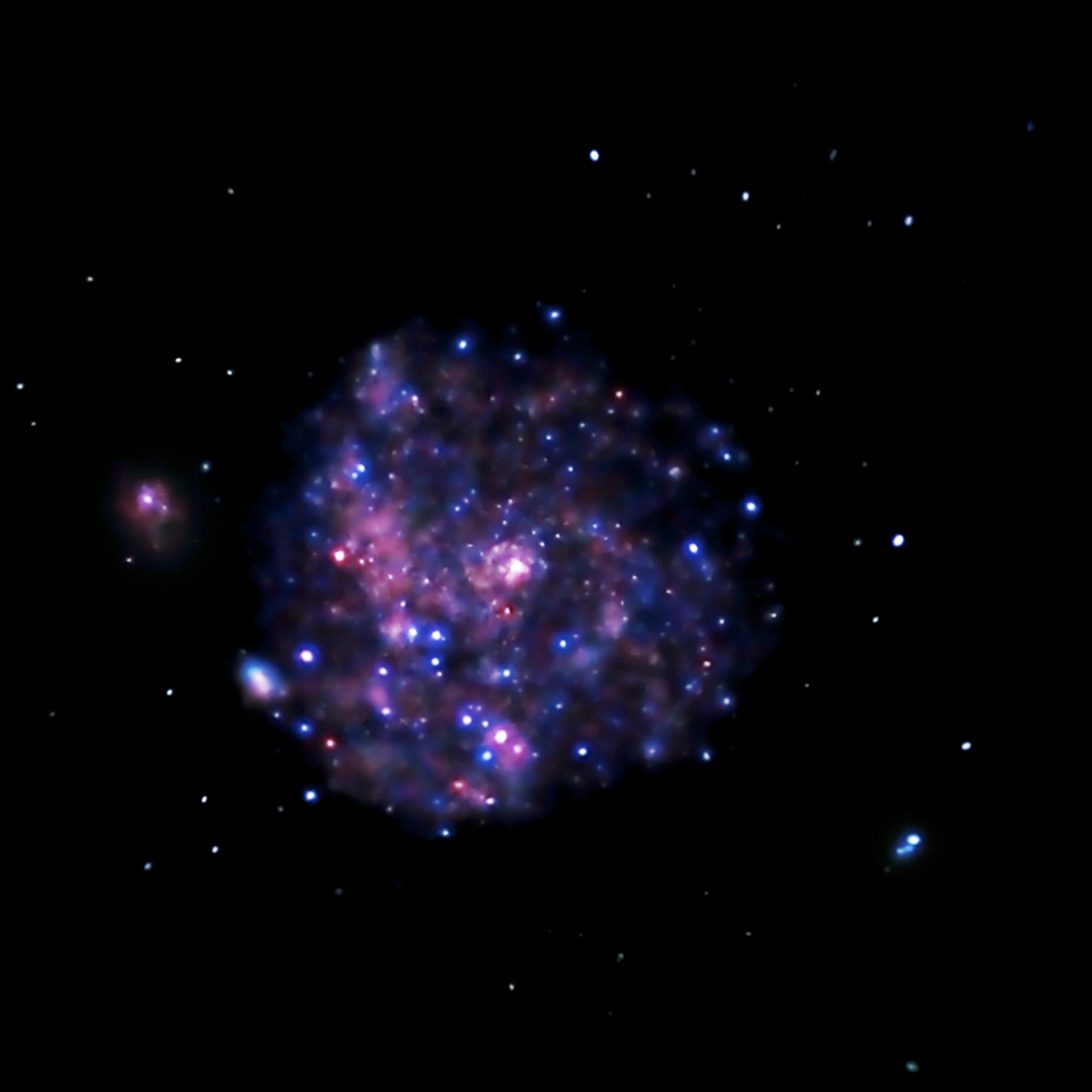 Chandra's image of Messier 101, taken in X-ray light, shows the high-energy features of this spiral galaxy. X-rays are generally created in violent and/or high-temperature events. The white dots are X-ray sources that include the remains of exploded stars as well as material colliding at extreme speeds around black holes. The pink and blue colors are emission from million-degree gas and from clusters of massive stars. The pink emission indicates lower-energy X-rays and the blue higher-energy X-rays. One reason astronomers study Messier 101's X-rays is to better understand how black holes grow in spiral galaxies.