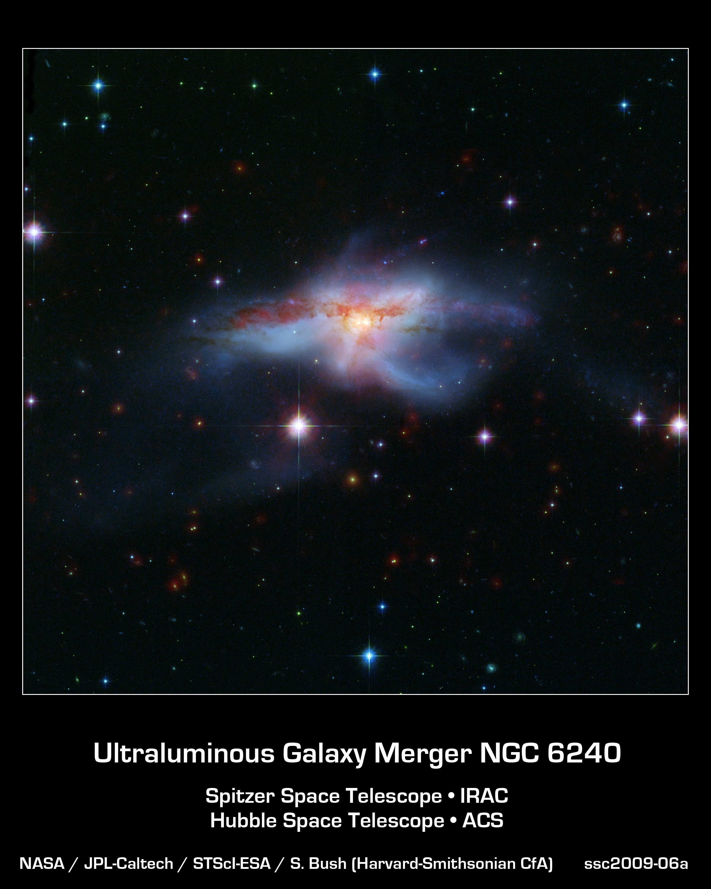 This image of a pair of colliding galaxies called NGC 6240 shows them in a rare, short-lived phase of their evolution just before they merge into a single, larger galaxy. The prolonged, violent collision has drastically altered the appearance of both galaxies and created huge amounts of heat -- turning NGC 6240 into an "infrared luminous" active galaxy.