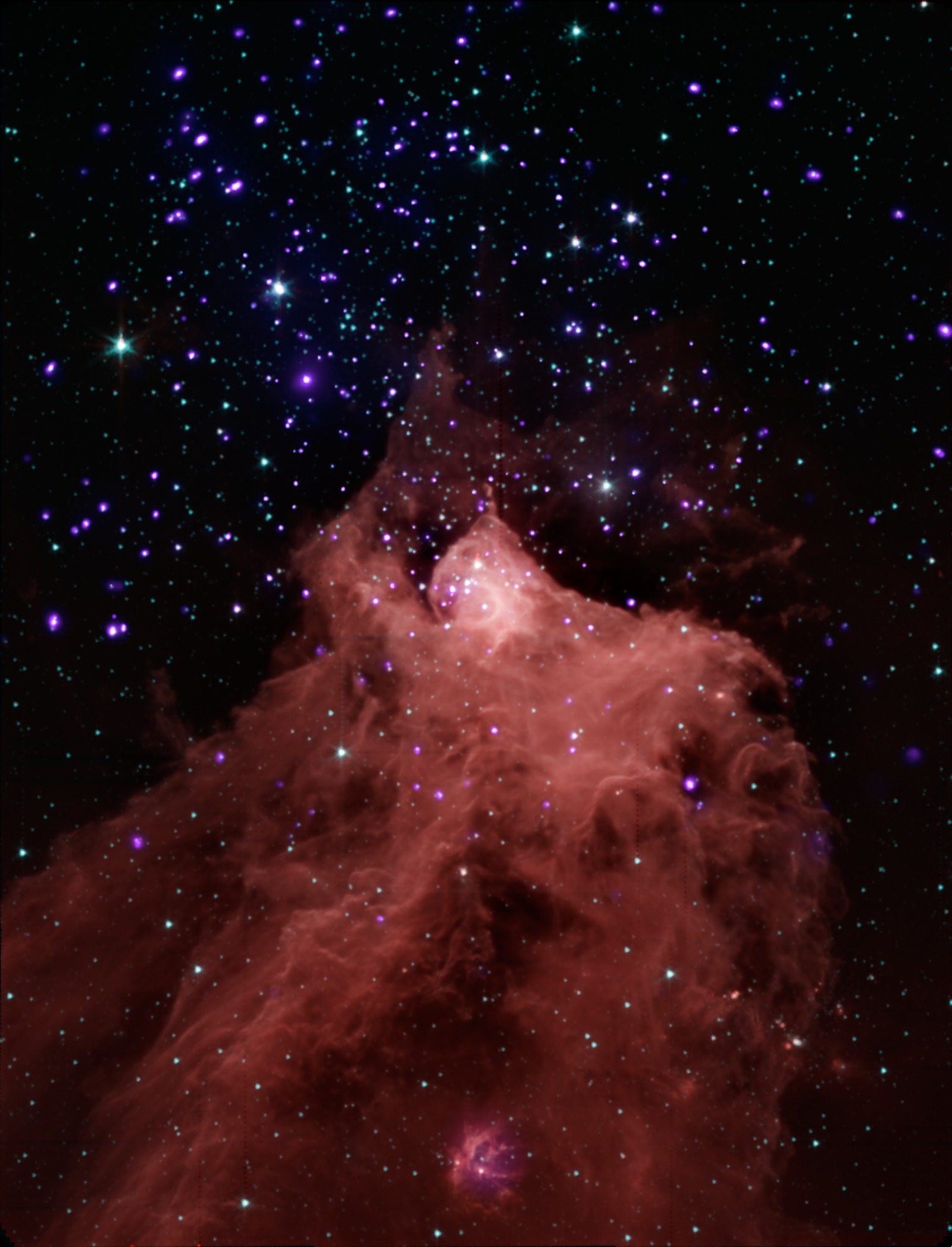 contains molecular hydrogen. The Spitzer data, in red, green and blue shows the molecular cloud (in the bottom part of the image) plus young stars in and around Cepheus B, and the Chandra data in violet shows the young stars in the field.