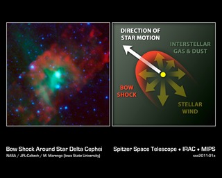 The diagram on the right illustrates how Delta Cephei's bow shock was formed. As the star speeds along through space, its wind hits interstellar gas and dust, causing it to pile up in the bow shock. A companion star to Delta Cephei, seen just below it, is lighting up the region, allowing Spitzer to better see the region. By examining the structure of the bow shock, astronomers were able to calculate how fast the star is losing mass.