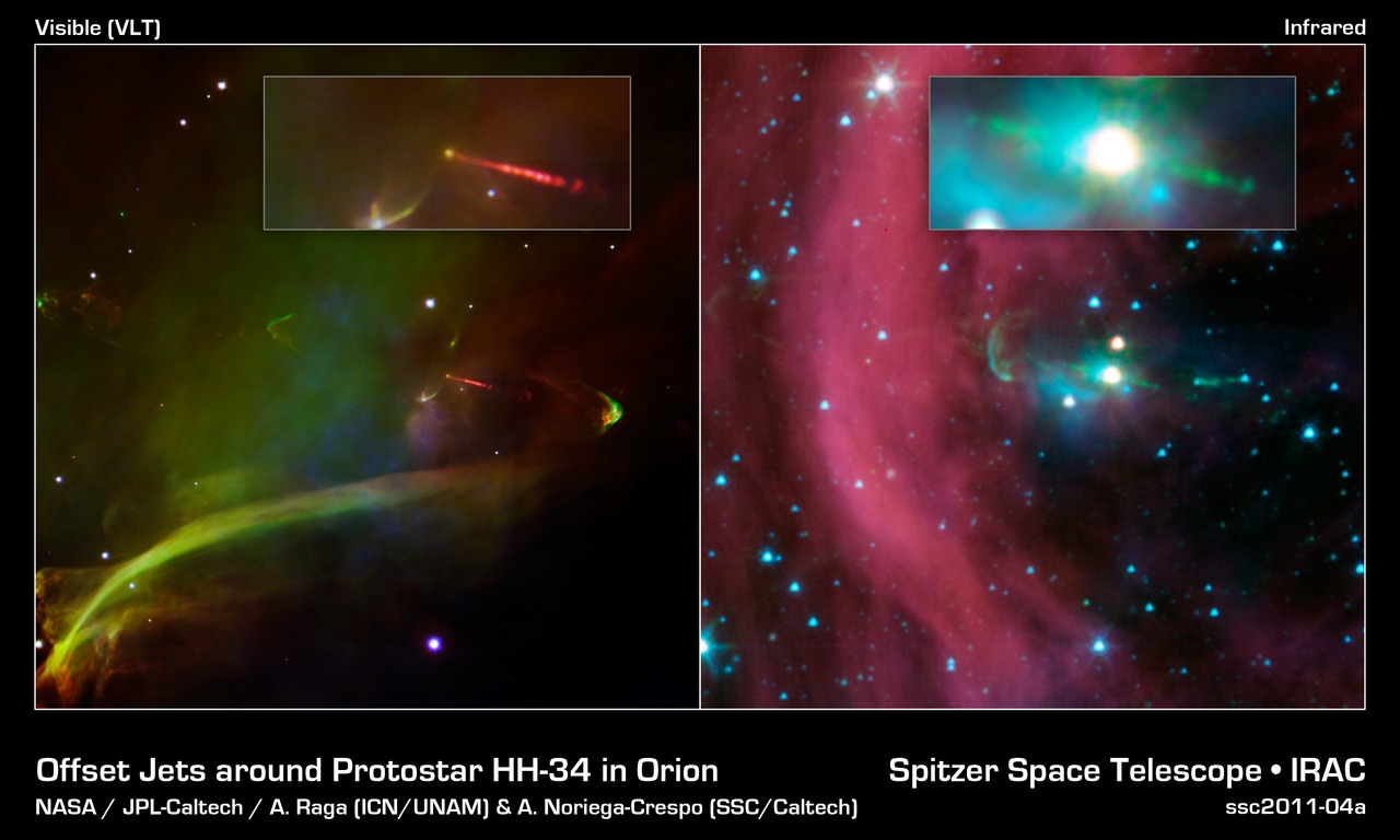 The Spitzer image shows that both of the twin jets, in a system called Herbig-Haro 34, are made up of identical knots of gas and dust, ejected one after another from the area around the star. By studying the spacing of these knots, and knowing the speed of the jets from previous studies, astronomers were able to determine that the visible jet (to the right of the star) punches its material out 4.5 years later than the counter-jet.