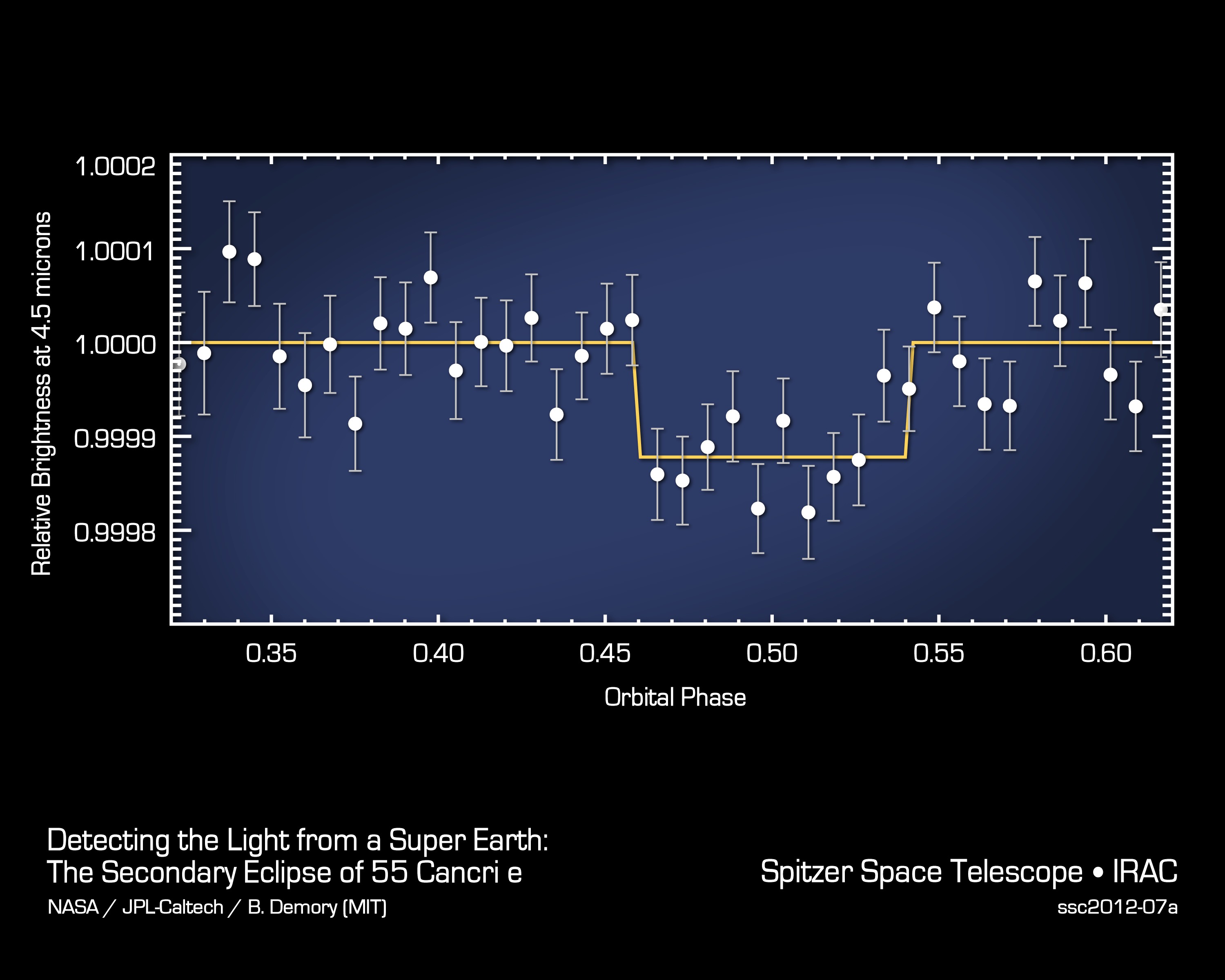 The plot shows how the infrared light from the 55 Cancri system, both the star and planet, changed as the planet passed behind its star in what is called an occultation. When the planet disappeared, the total light dropped, and then increased back to normal levels as the planet circled back into view. The drop indicated how much light came directly from the planet itself. This type of information is important for studying the temperatures and compositions of planetary atmospheres beyond our own.