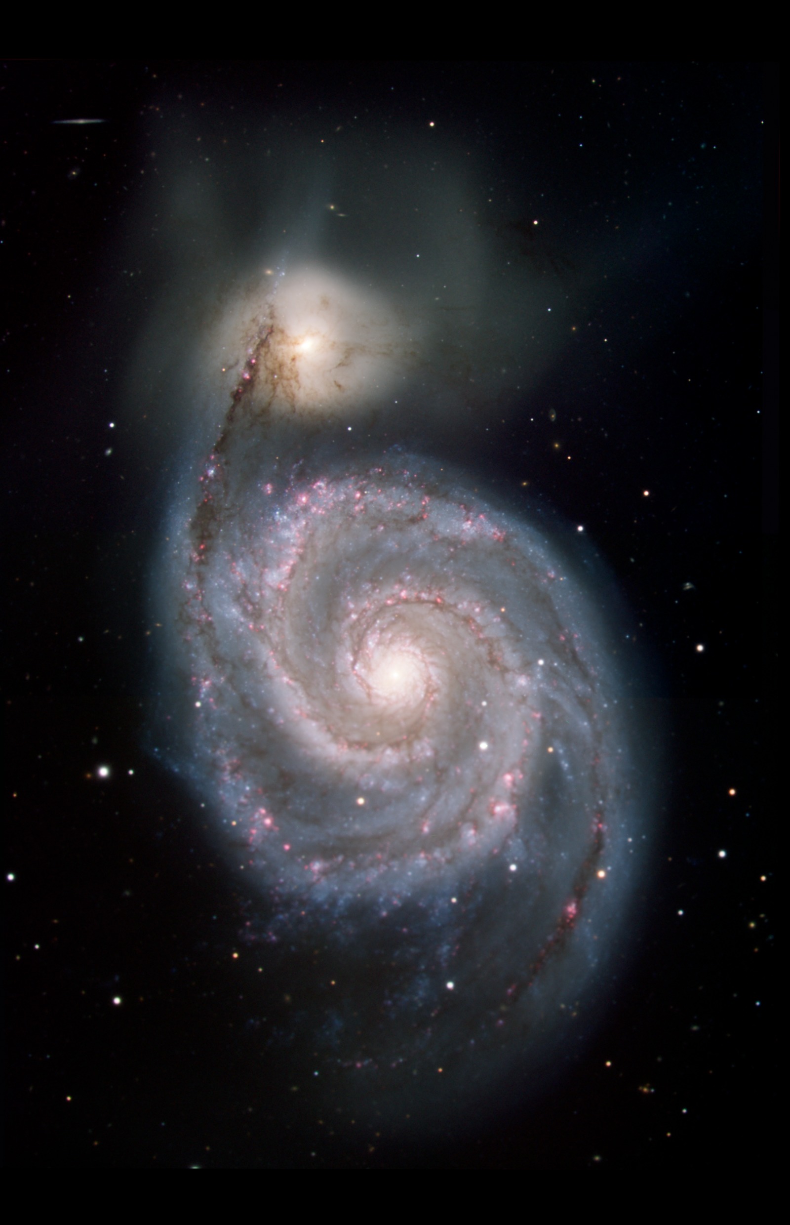 This image shows the Whirlpool galaxy, also known as Messier 51 and NGC 5194/5195, which is actually a pair of galaxies. Located approximately 23 million light-years away, it resides in the constellation Canes Venatici. This image presents the galaxy's appearance in visible light, from the Kitt Peak National Observatory 2.1-meter (6.8-foot) telescope and shows light at 0.4 microns (blue) and 0.7 microns (green).