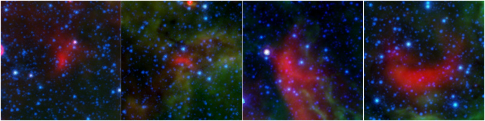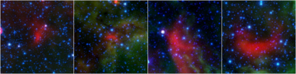 These four images show bow shocks, or arcs of warm dust formed as winds from fast-moving stars push aside dust grains scattered sparsely through most of the nebula.