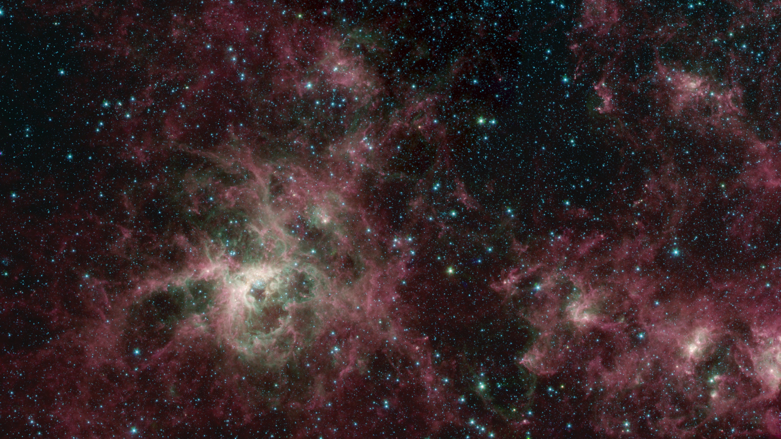 This image from NASA's Spitzer Space Telescope shows the Tarantula Nebula in three wavelengths of infrared light, each represented by a different color. The magenta-colored regions are dust composed of molecules called polycyclic aromatic hydrocarbons (PAHs), which are also found in ash from coal, wood and oil fires on Earth. PAHs emit in multiple wavelengths. The PAHs emit in multiple wavelengths, so the magenta color is a combination of red (corresponding to an infrared wavelength of 8 micrometers) and blue (3.6 micrometers). The green color in this image shows the presence of particularly hot gas emitting infrared light at a wavelength of 4.5 micrometers. The stars in the image are mostly a combination of green and blue. White hues indicate regions that radiate in all three wavelengths.
