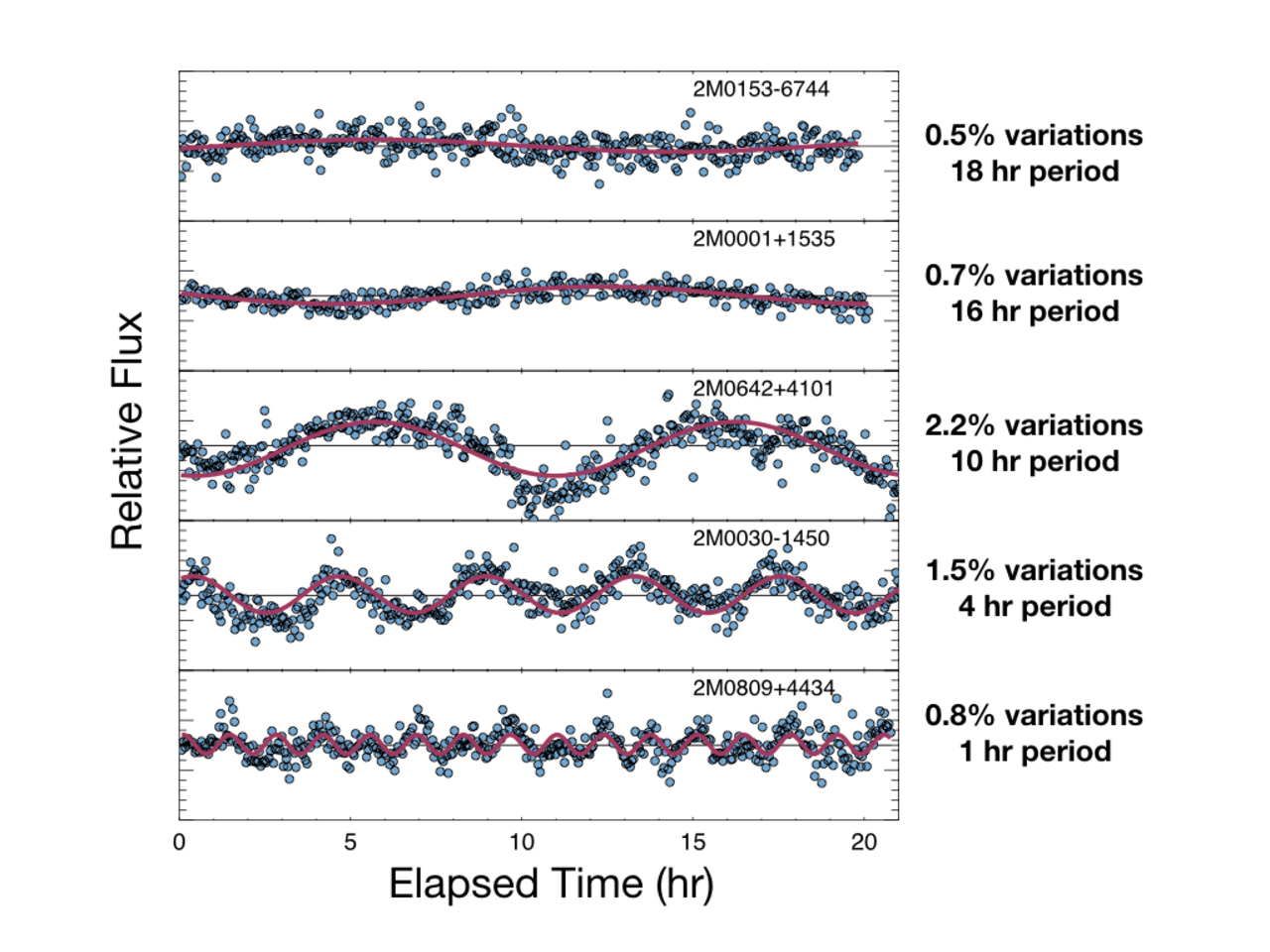These graphs show how the light from brown dwarfs are seen to vary over time. The infrared brightnesses were measured by NASA’s Spitzer Space Telescope and demonstrate a wide range of variability in a large number of young brown dwarfs, indicative of their rotation and weather patterns.