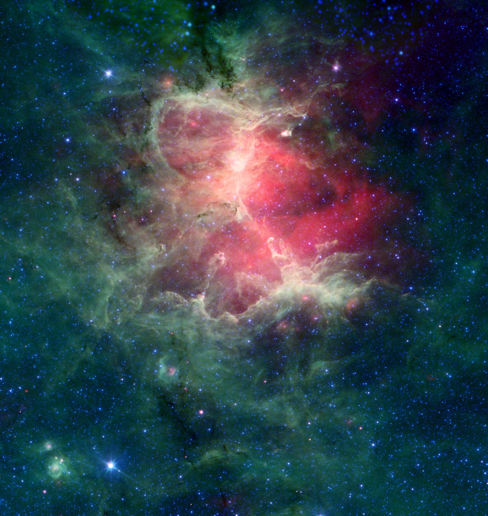 In this image, infrared light at wavelengths of 4.5, 8.0, and 24 microns is displayed as blue, green, and red, respectively. The data are from the mission archive of NASA’s Spitzer Space Telescope.