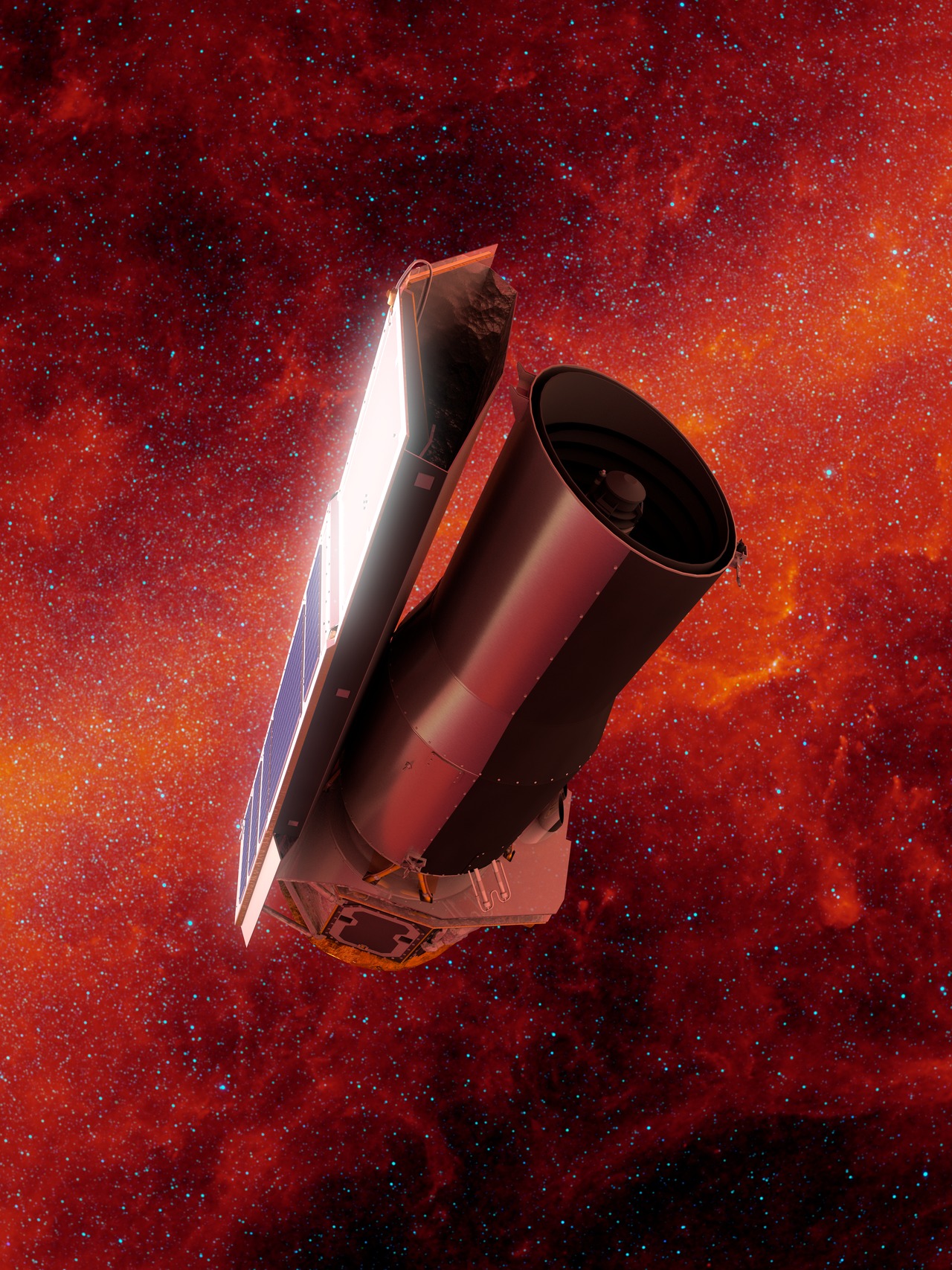 This artist's concept depicts NASA's Spitzer Space Telescope in space much as it would appear at the end of its mission on January 30, 2020. The backdrop depicts the sky in infrared light much as Spitzer would have seen it early in its mission.