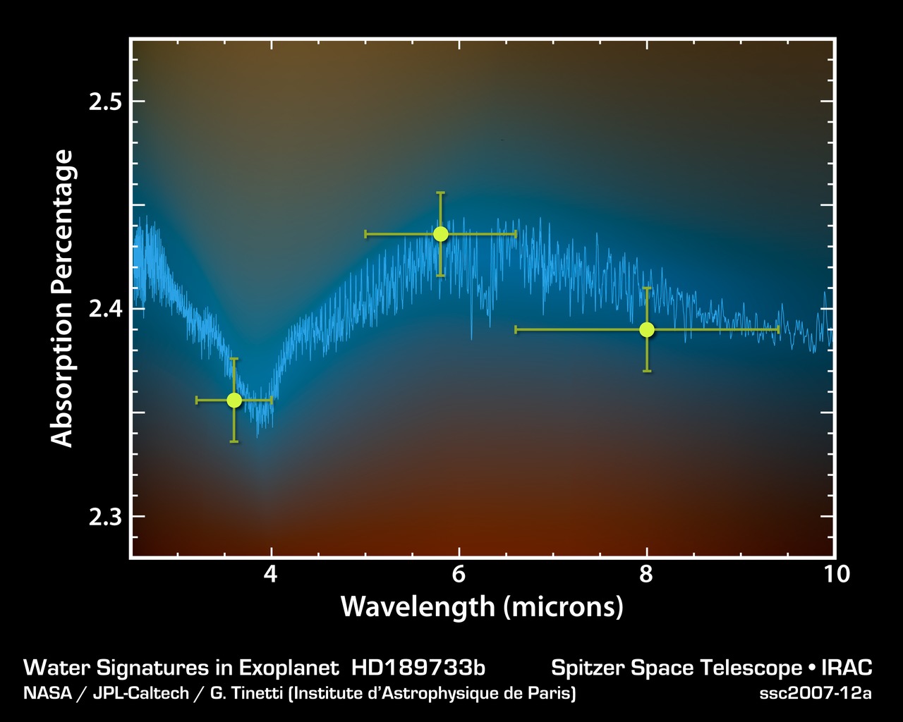 This plot of data from NASA's Spitzer Space Telescope tells astronomers that a toasty gas exoplanet, or a planet beyond our solar system, contains water vapor.