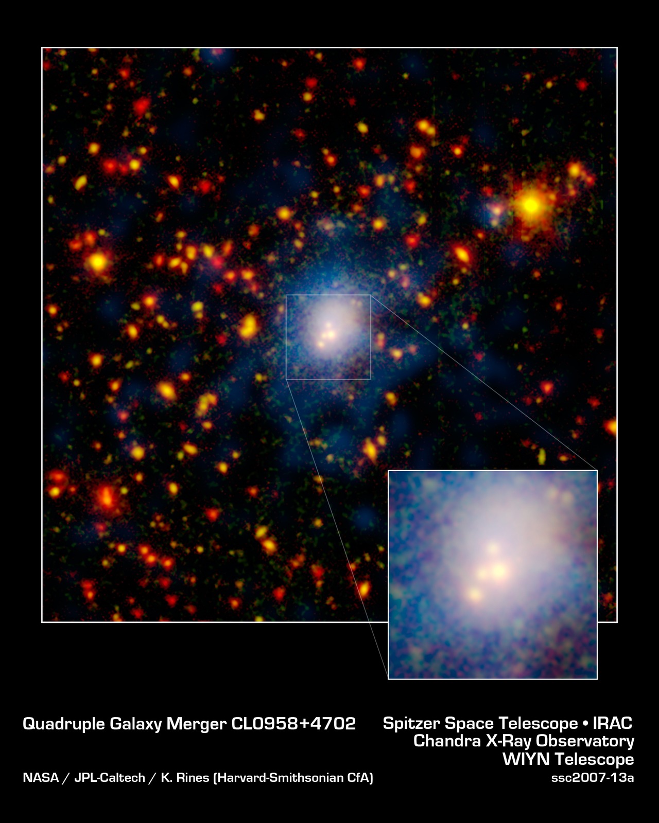 One of the biggest galaxy collisions ever observed is taking place at the center of this image. The four yellow blobs in the middle are large galaxies that have begun to tangle and ultimately merge into a single gargantuan galaxy.