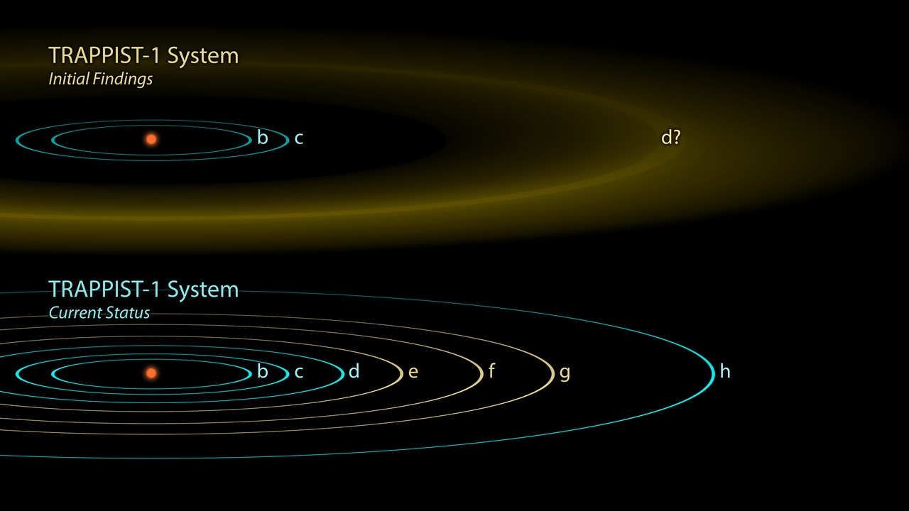The first observations of the TRAPPIST-1 system reported in 2016 revealed three planets orbiting a small, red-dwarf star, though the exact location of the outermost one, was not well-determined (yellow band, top image). Follow-up observations with NASA's Spitzer Space Telescope, as well as...