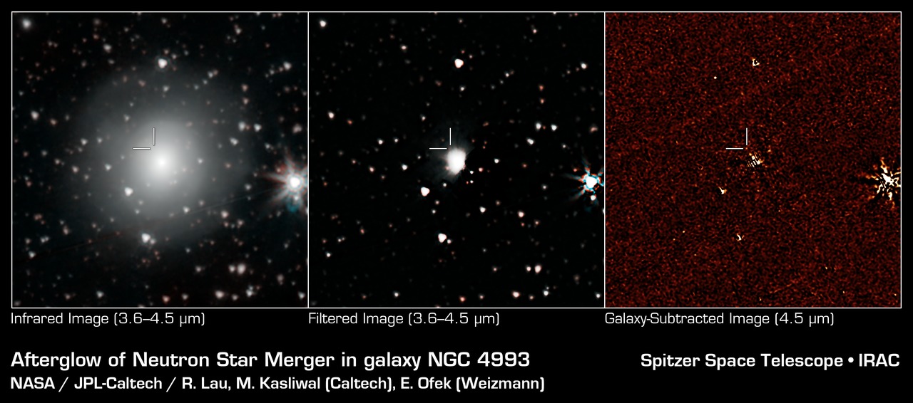 NASAs Spitzer Space Telescope has provisionally detected the faint afterglow of the explosive merger of two neutron stars in the galaxy NGC 4993. The event, labeled GW170817, was initially detected nearly simultaneously in gravitational waves and gamma rays, but subsequent observations by many...