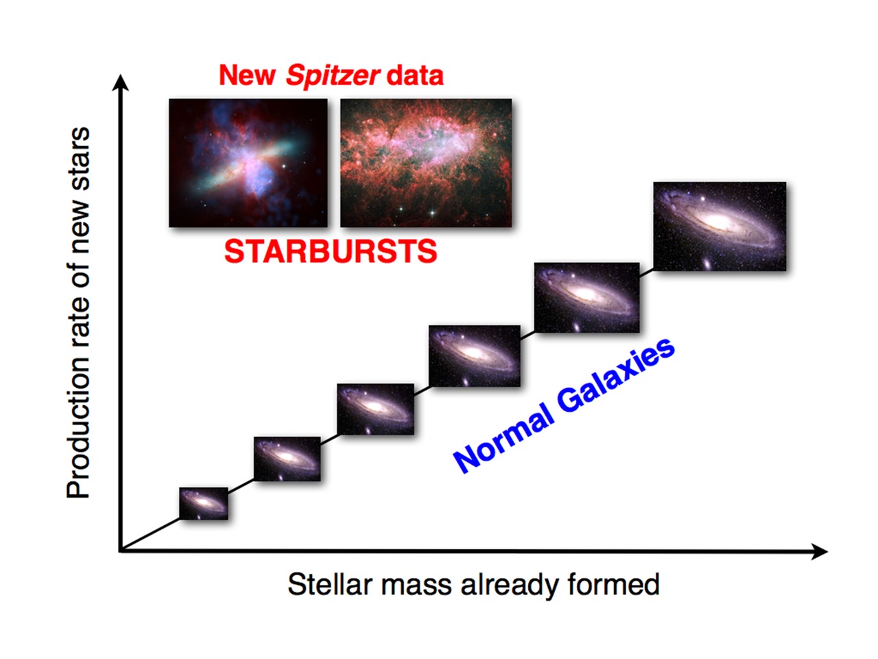 Over their individual histories, the vast majority of galaxies are thought to produce stars at relatively slow rates. This slow-and-steady pace has continually added to the overall population of stars in galaxies and, by extension, the broader universe, as illustrated along the horizontal/x-axis...