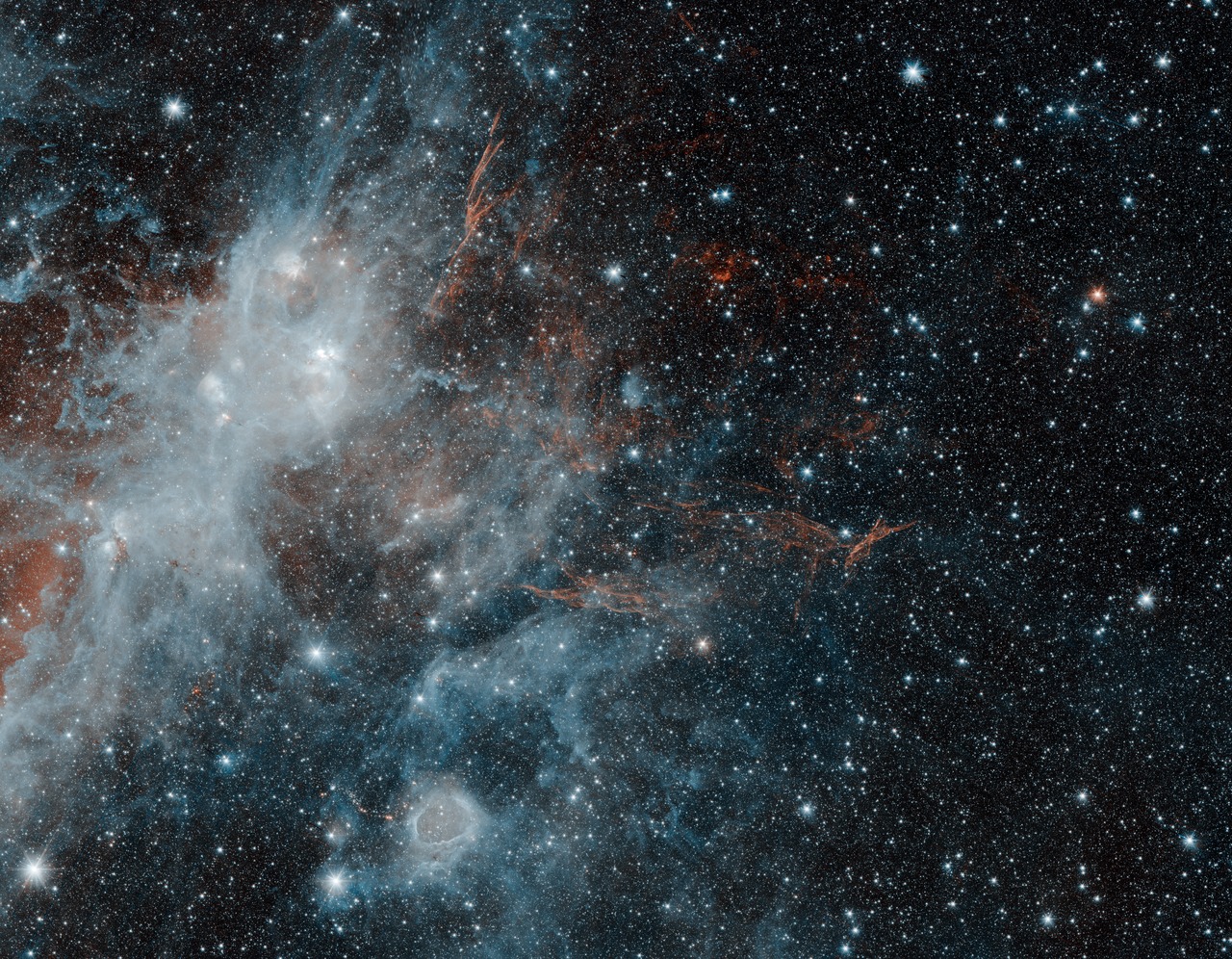 Thin, red veins of energized gas mark the location of the supernova remnant HBH3 in this image from NASA's Spitzer Space Telescope.