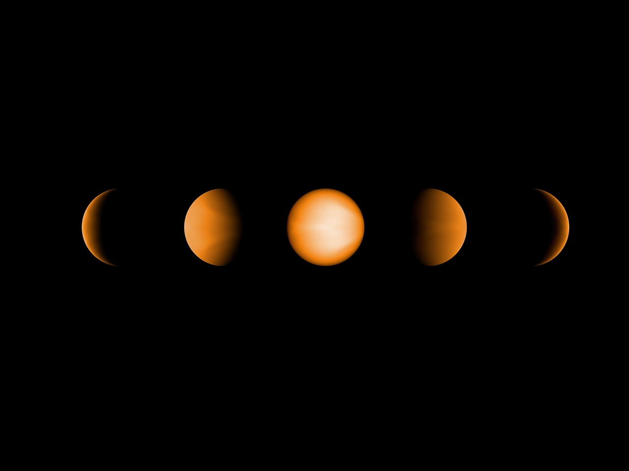 These simulated views of the ultrahot Jupiter WASP-121b show what the planet might look like to the human eye from five different vantage points, illuminated to different degrees by its parent star.