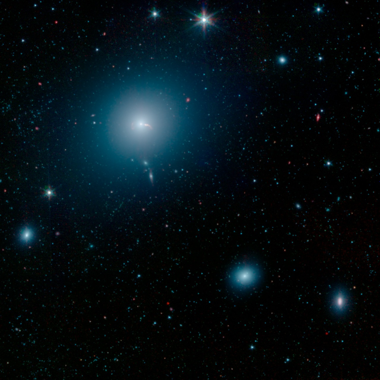 This image shows the merger of two galaxies, known as NGC 6786 (right) and UGC 11415 (left), also collectively called VII Zw 96. It is composed of images from three Spitzer Infrared Array Camera (IRAC) channels: IRAC channel 1 in blue, IRAC channel 2 in green and IRAC channel 3 in red.