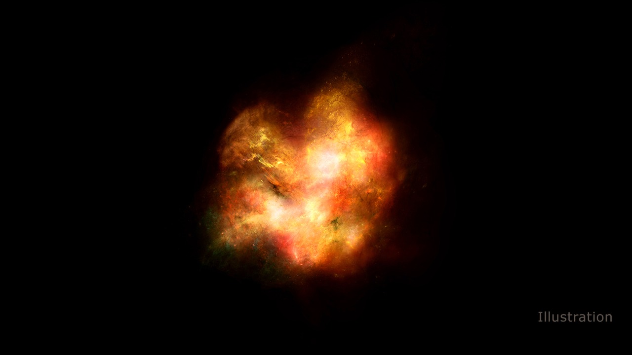 This artist's illustration shows what one of the very first galaxies in the universe might have looked like. High levels of violent star formation and star death would have illuminated the gas filling the space between stars, making the galaxy largely opaque and without a clear structure.