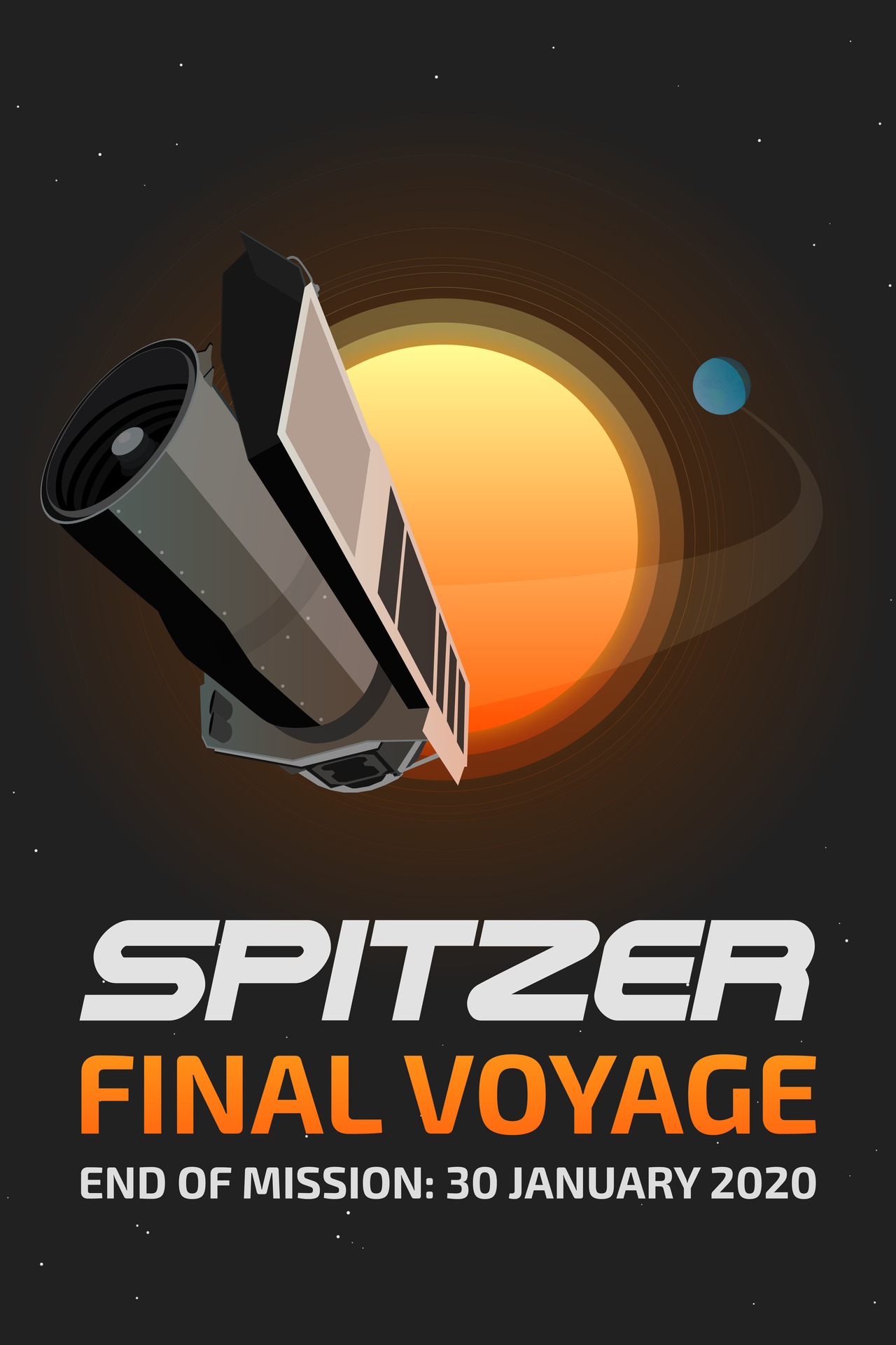 A poster celebrating Spitzer Final Voyage. On January 30th 2020, NASA's Spitzer Space Telescope will complete its mission. The Spitzer Final Voyage web page will tell its story, showcase new science and highlight its most outstanding achievements during the past 16 years in space.