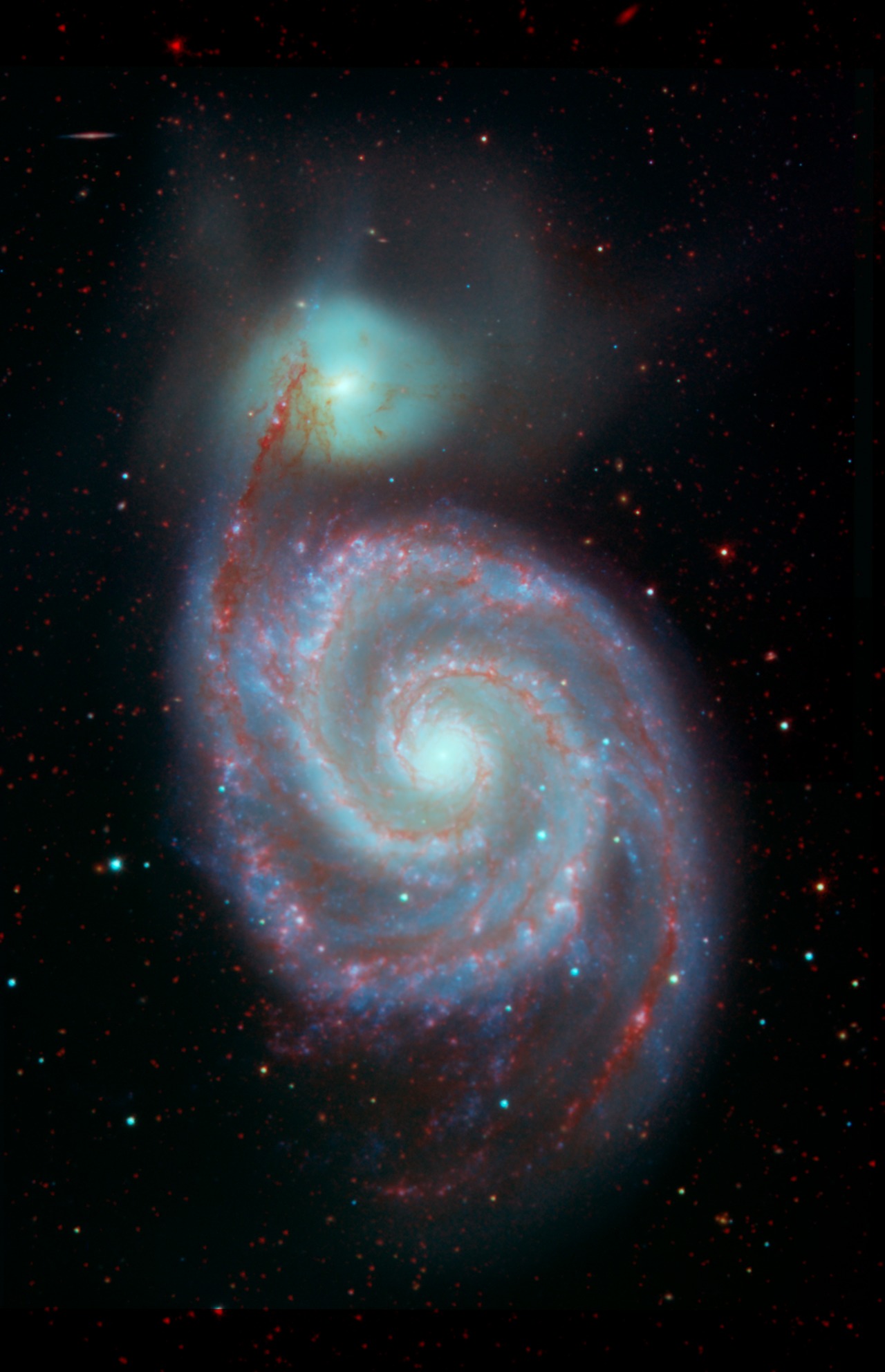 This image shows the Whirlpool galaxy, also known as Messier 51 and NGC 5194/5195, which is actually a pair of galaxies. Located approximately 23 million light-years away, it resides in the constellation Canes Venatici. Here we see three wavelengths of infrared light: 3.6 microns (shown in blue),...