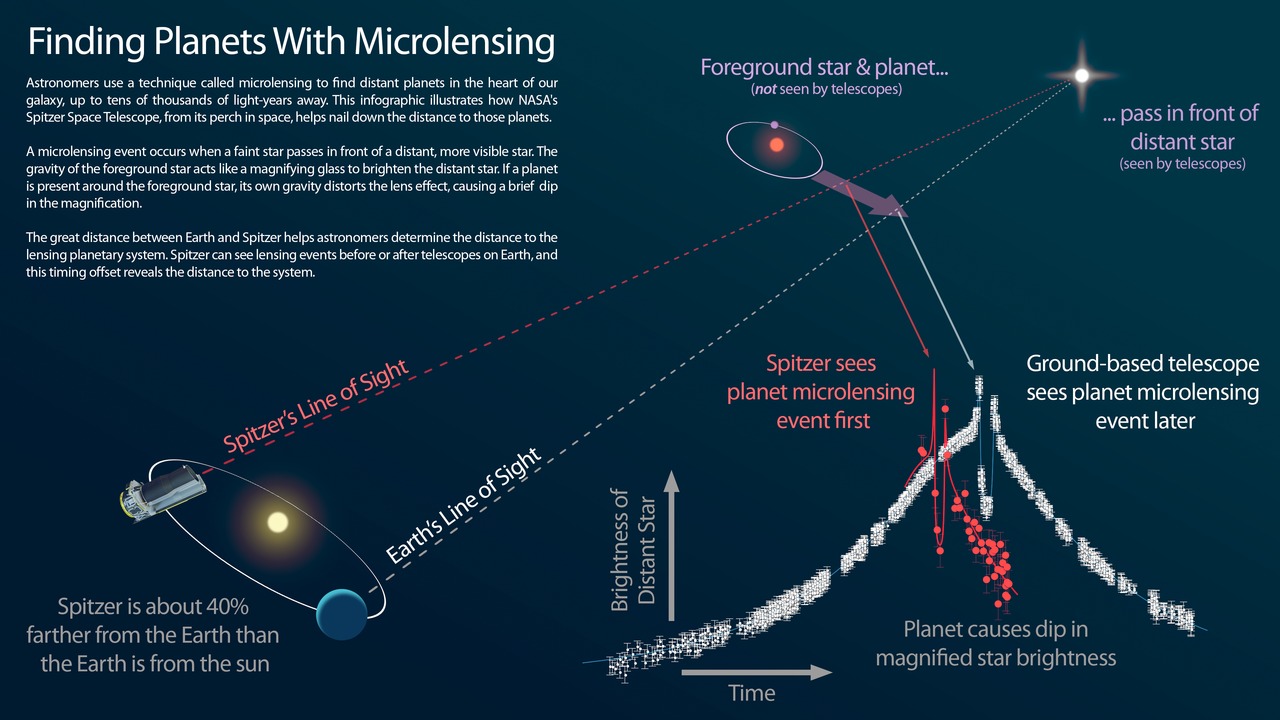 This infographic explains how NASA's Spitzer Space Telescope can be used in tandem with a telescope on the ground to measure the distances to planets discovered using the "microlensing" technique.