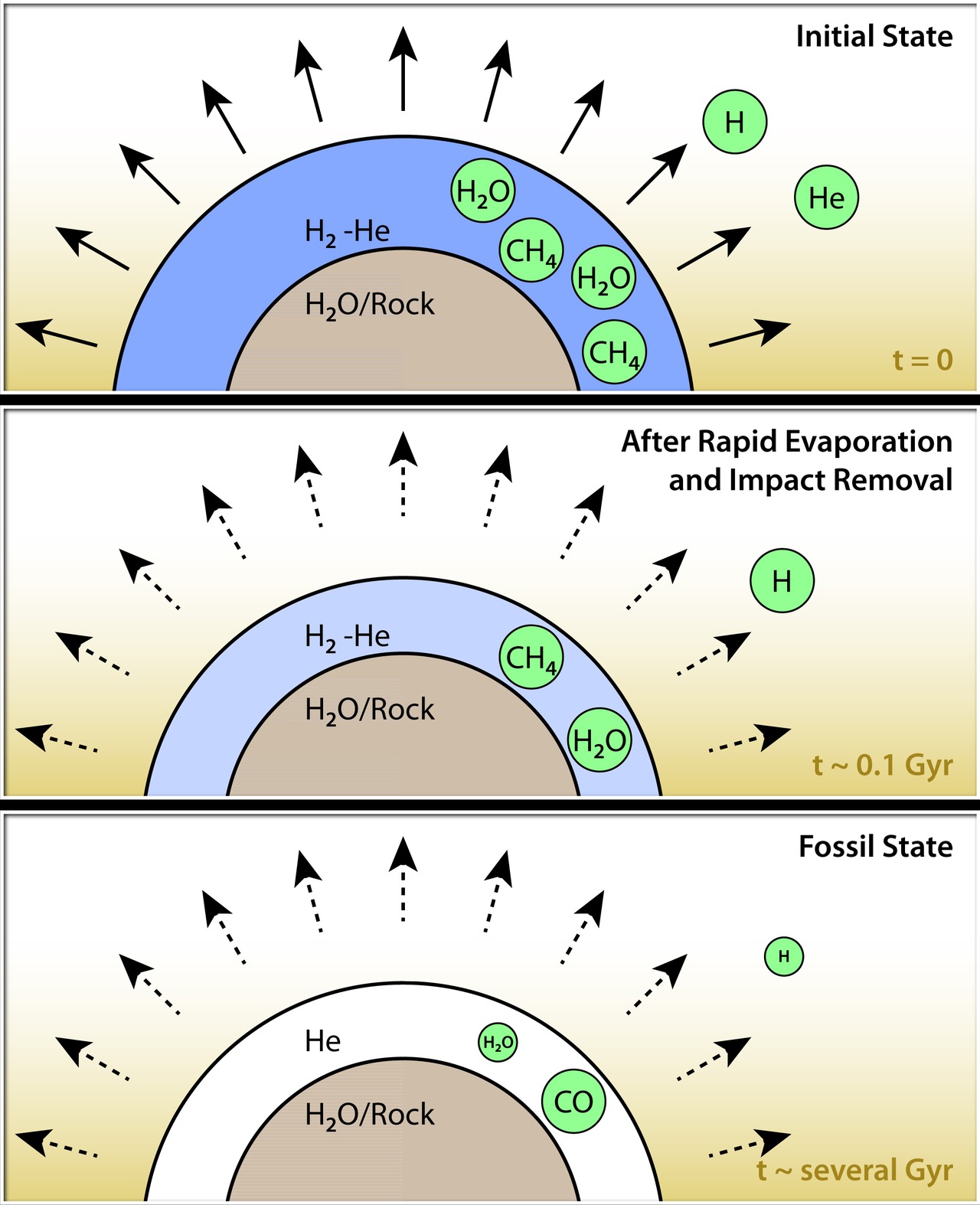 This diagram illustrates how hypothetical helium atmospheres might form. These would be on planets about the mass of Neptune, or smaller, which orbit tightly to their stars, whipping around in just days.