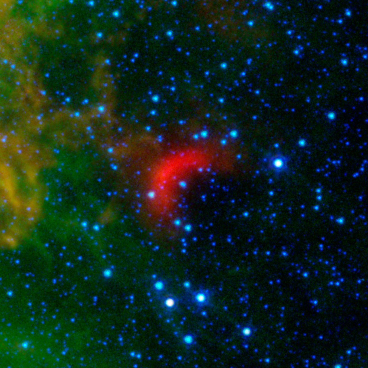 Bow shocks thought to mark the paths of massive, speeding stars are highlighted in this image from NASA's Wide-field Infrared Survey Explorer, or WISE.