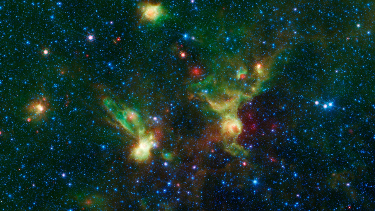 Scores of baby stars shrouded by dust are revealed in this infrared image of the star-forming region NGC 2174, as seen by NASAs Spitzer Space Telescope. Some of the clouds in the region resemble the face of a monkey in visible-light images, hence the nebula's nickname: the "Monkey Head."