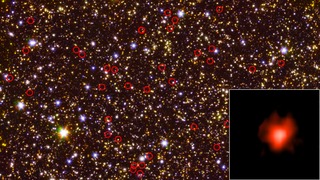 The galaxy cluster called MOO J1142+1527 can be seen here as it existed when light left it 8.5 billion years ago. The red galaxies at the center of the image make up the heart of the galaxy cluster.