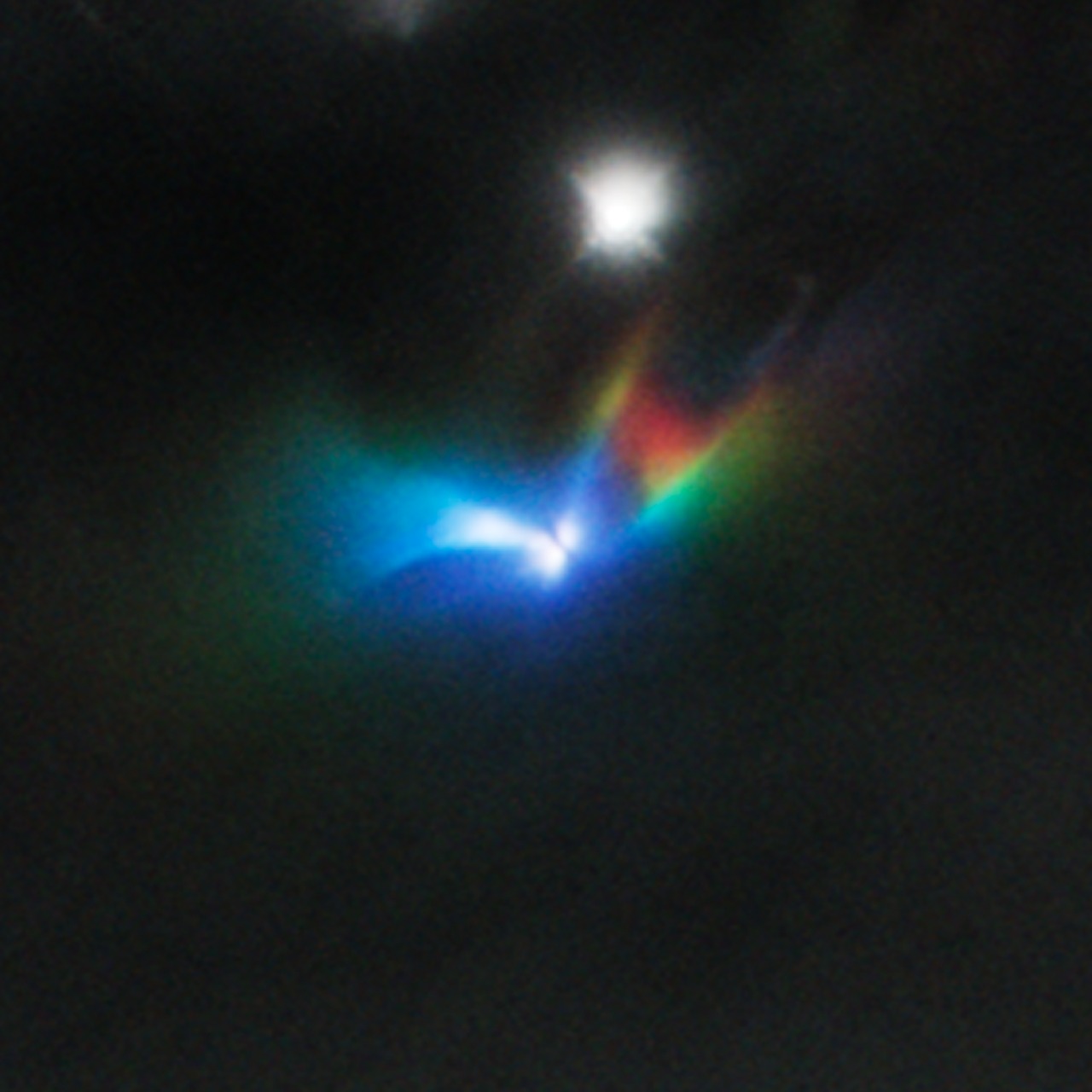 Flashes of light pulsing through the nebula surrounding the protostellar object LRLL 54361 are captured in this time-coded prismatic image from NASA's Hubble Space Telescope. These surprisingly regular pulsations, recurring every 25.34 days, were discovered by NASA's Spitzer Space Telescope...